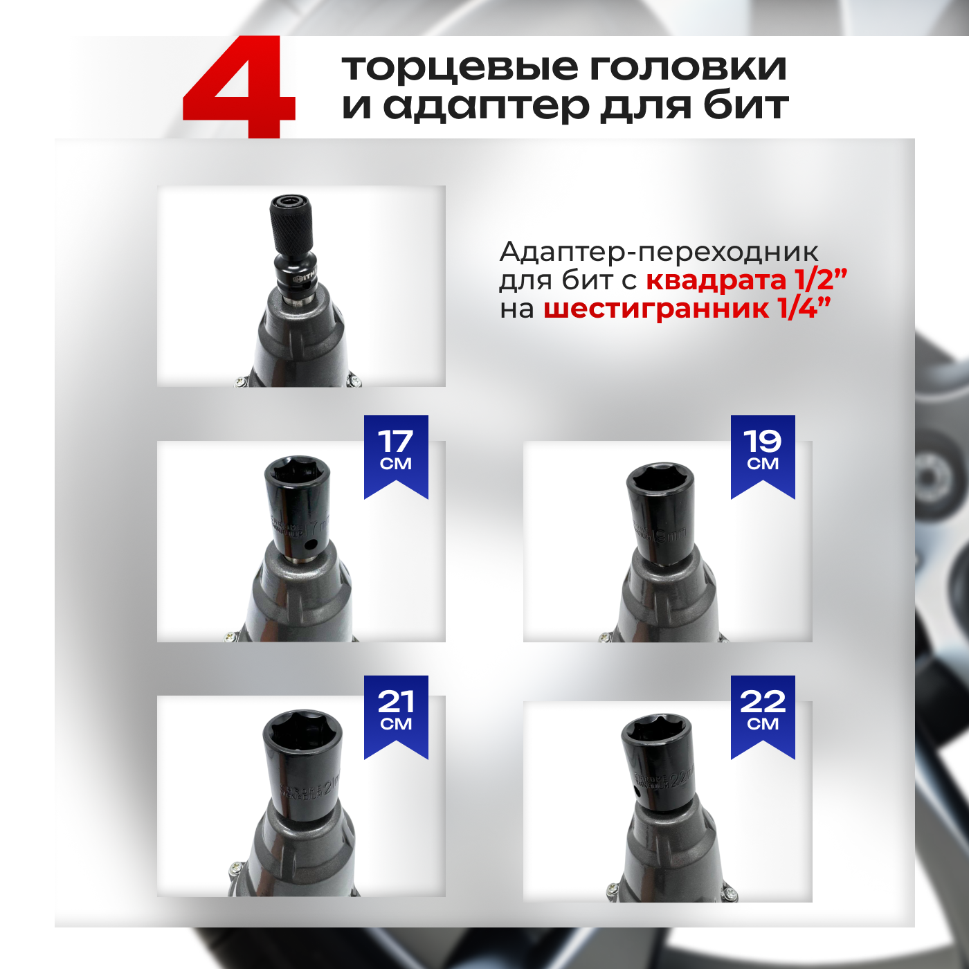 | Комплектация | Сетевой ударный гайковерт; Торцевые головки (17 мм, 19 мм, 21 мм, 22 мм)- 4 шт; Запасные угольные щетки - 2 шт; Паспорт (инструкция; Пластиковый кейс; Адаптер для бит с квадрата 1/2 на шестигранник 1/4 ударный - 1 шт |