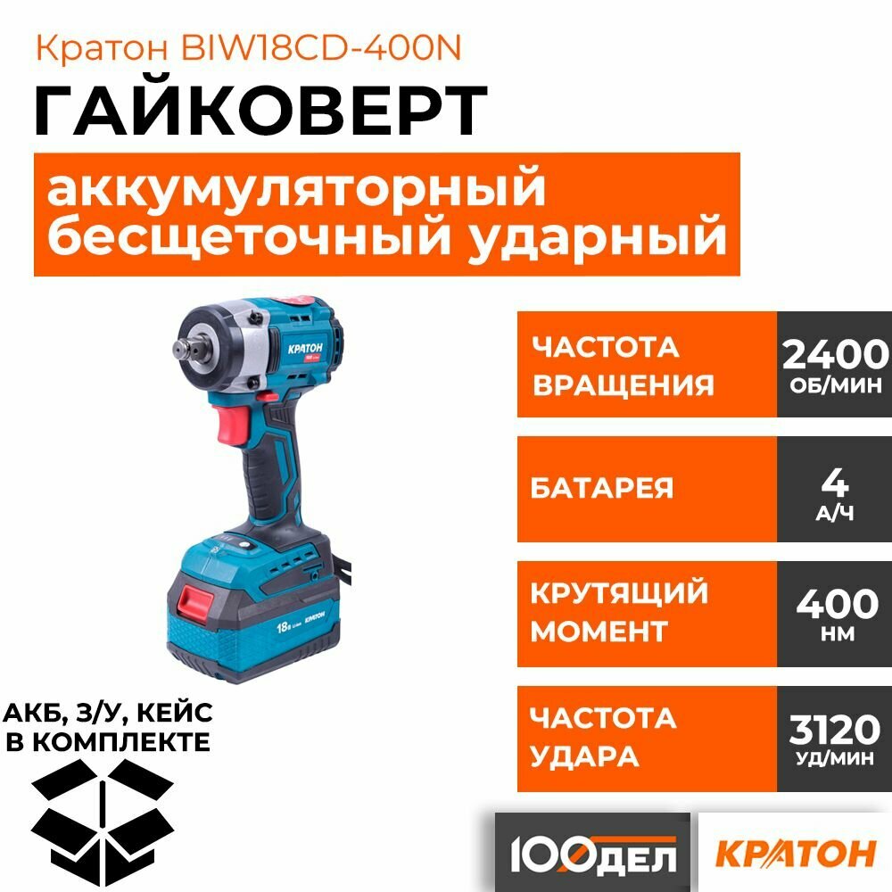 10 цен на Гайковерт аккумуляторный ударный бесщеточный кратон BIW18CD-400N-OFA SET (АКБ 4,0Ач; ЗУ + кейс)