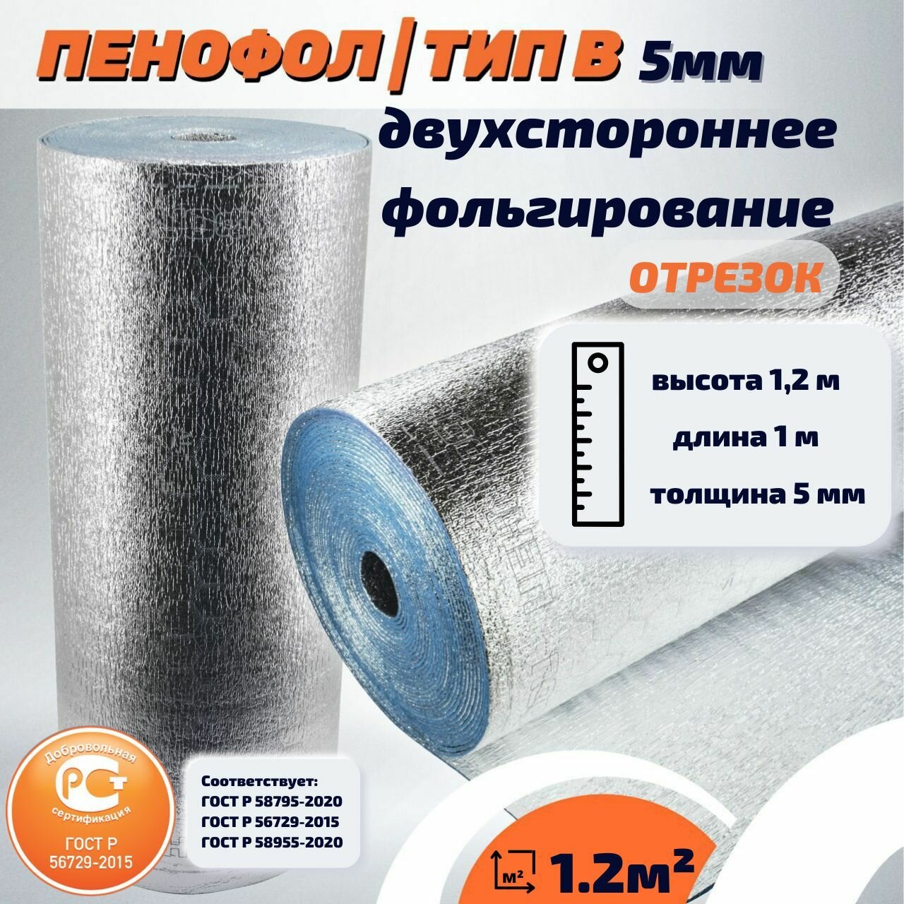 Отрезок Фольгированный утеплитель пенофол 2000 В5 5 мм двухстороннее фольгирование ГОСТ 1 метр (1.2м2) информация: