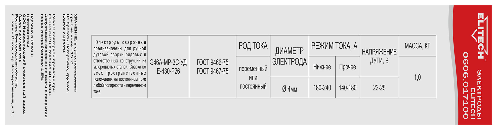 Электрод сварочный для стали Elitech МР-3С 4 мм 1 кг информация: