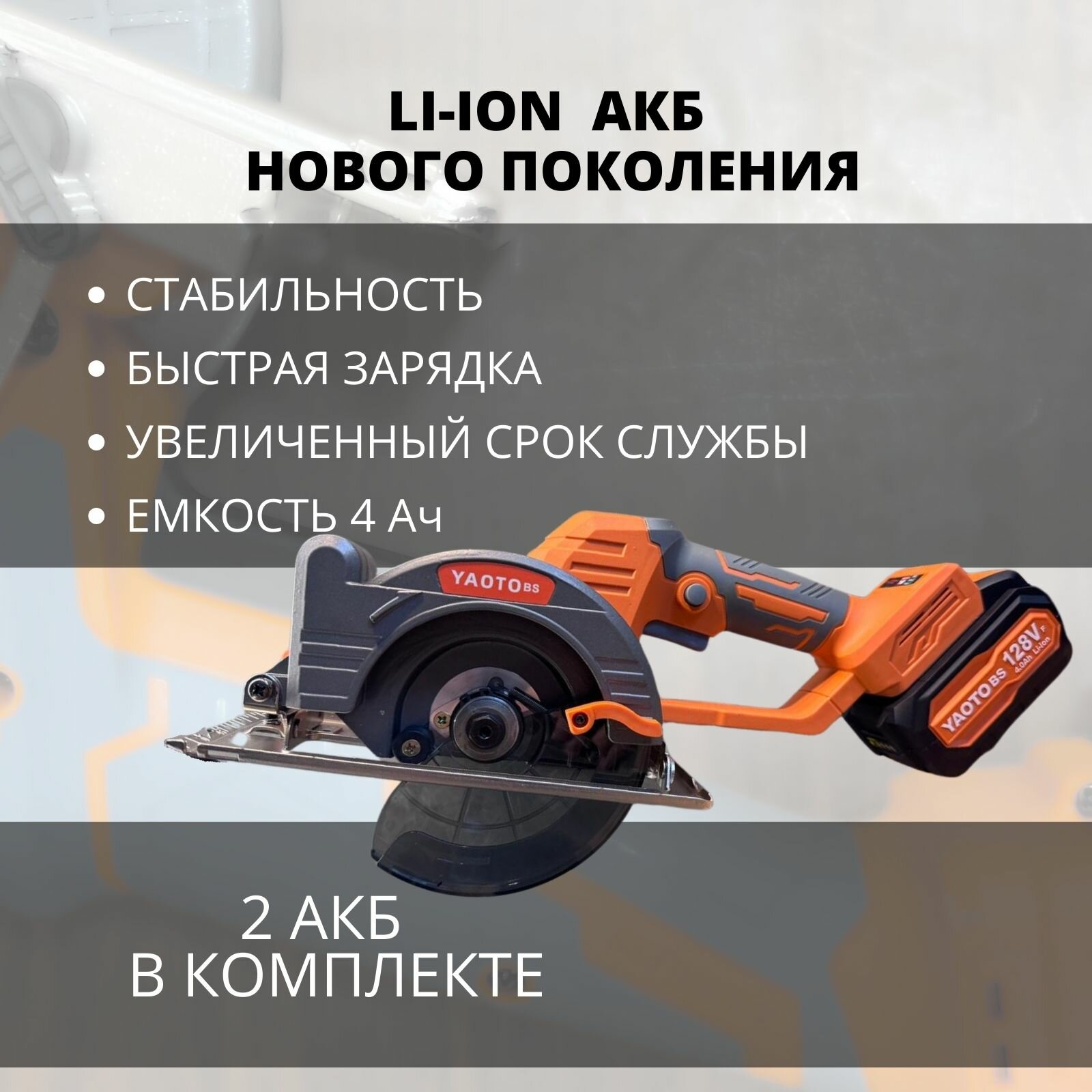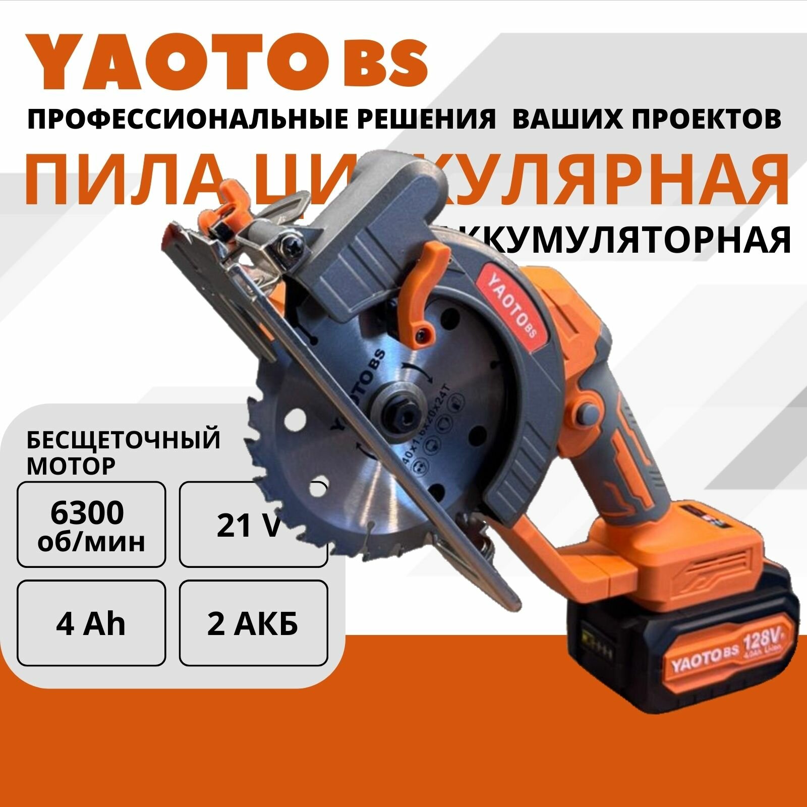 Пила аккумуляторная циркулярная дисковая YAOTO BS 128Vf 21В, 2 АКБ LI-ION 4 Ач, 6300 об/мин, бесщеточная информация: