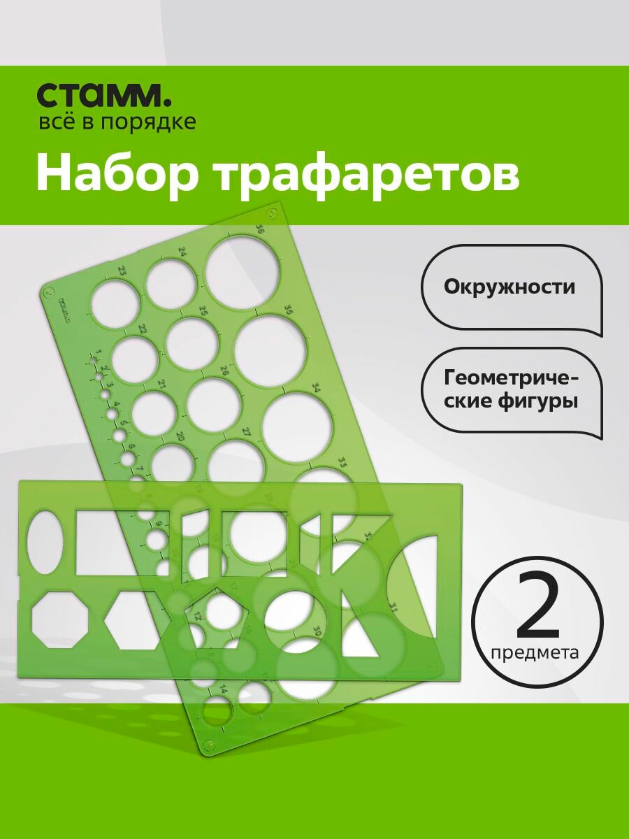 Набор трафаретов (Геометрические фигуры, окружности) СТАММ, пластиковый, зелёный информация: