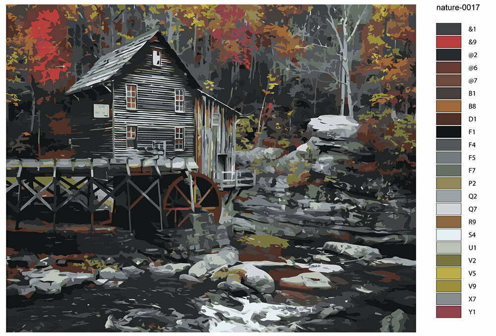 Картина по номерам на холсте с подрамником "Природа: Пейзаж с водяной мельницей на ручье в осеннем лесу", Раскраска 1 330 ₽