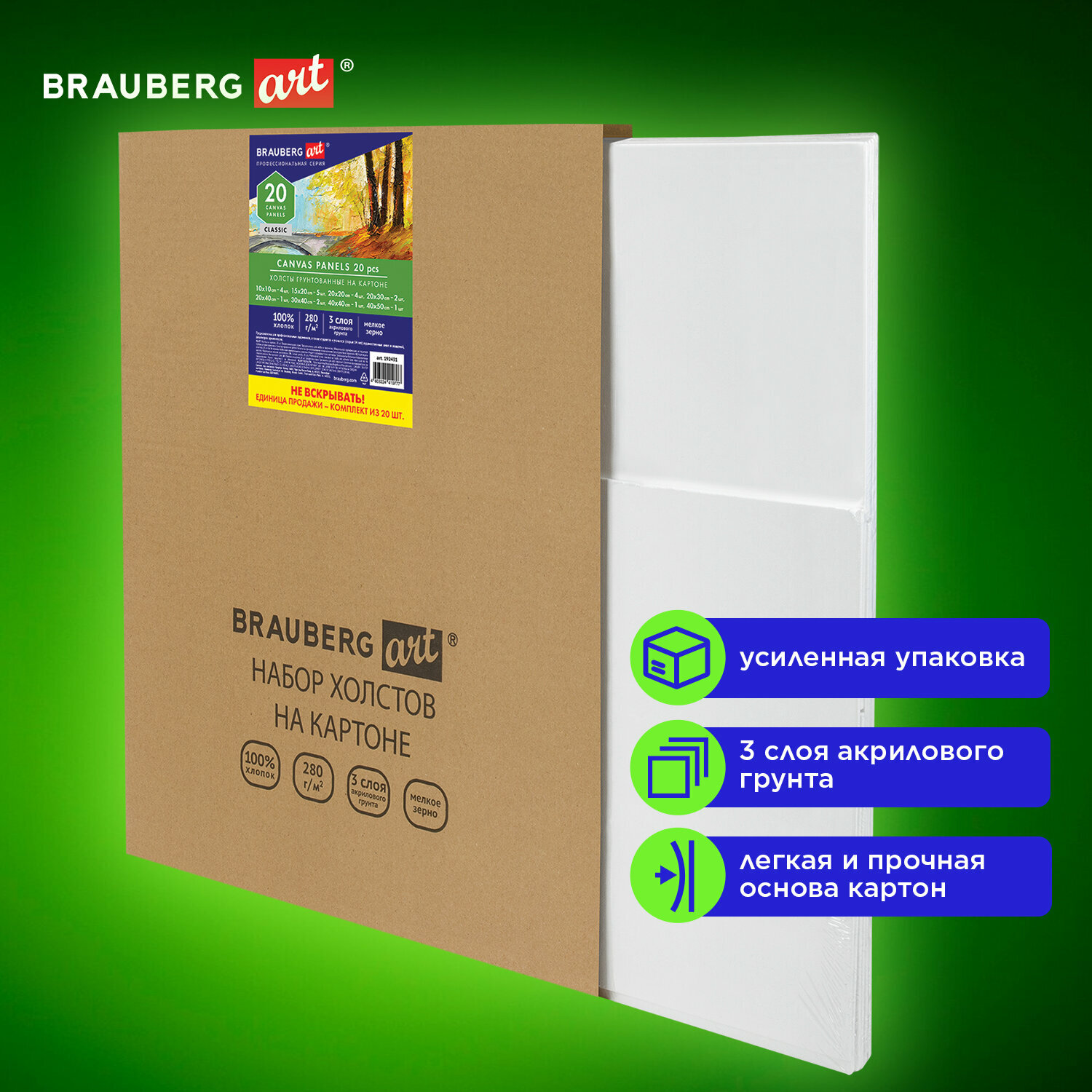 Холсты Brauberg на картоне набор 20 штук, 280г/м2, грунт, 100% хлопок, ART CLASSIC, Х информация: