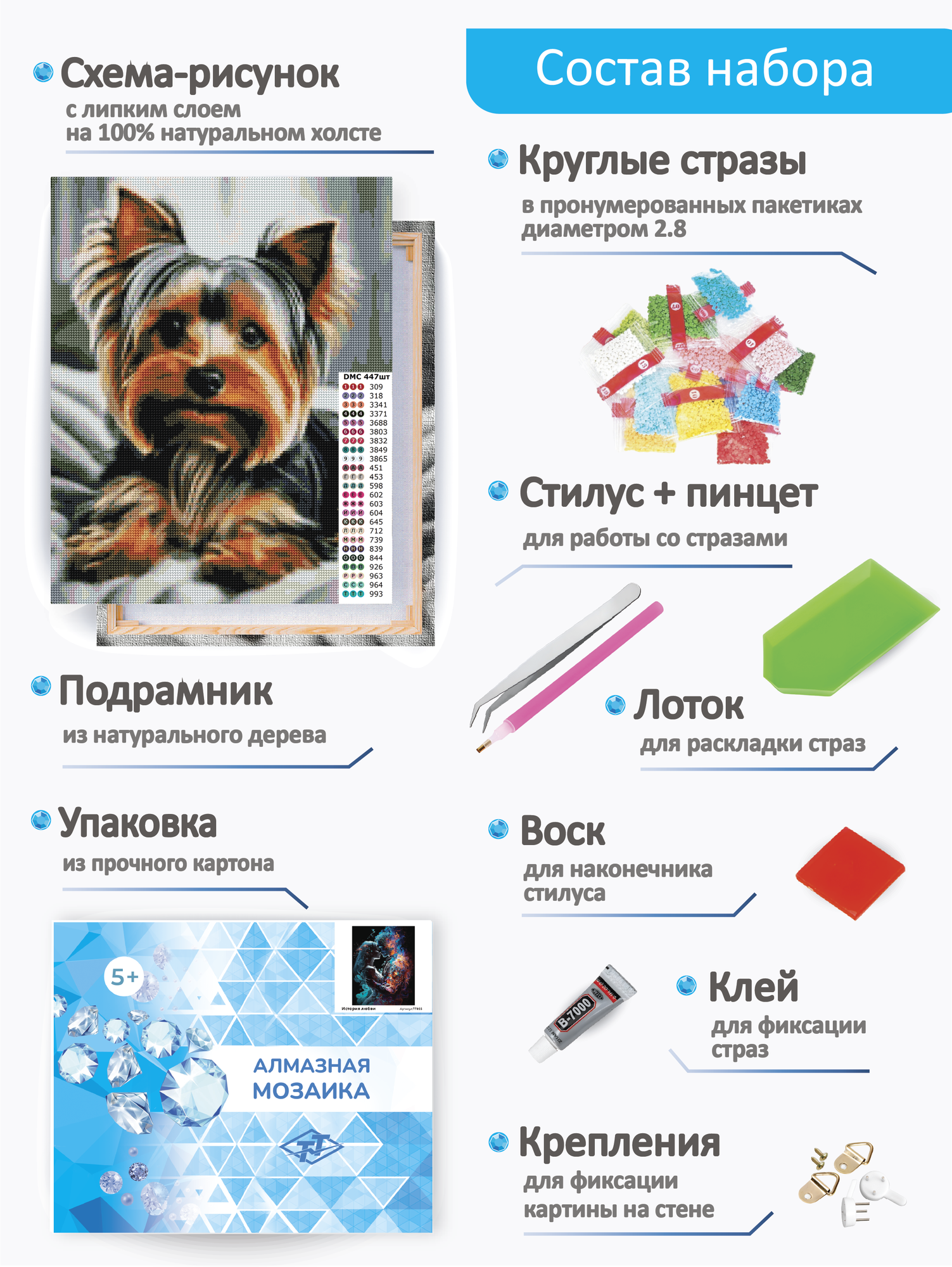 | Комплектация | Холст на подрамнике, акриловые стразы, стилус, клей, лоток, инструкция с нумерацией, крепеж. |