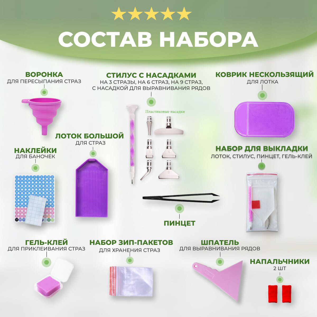 | Комплектация | - большой лоток для страз - 2 напальчника - стилус с набором насадок - пинцет - выравниватель рядов страз - набор наклеек на баночки - набор зип пакетов - набор гелиевых подушечек для стилуса - стандартный набор для выкладки - воронка для сбора страз - нескользящий коврик |