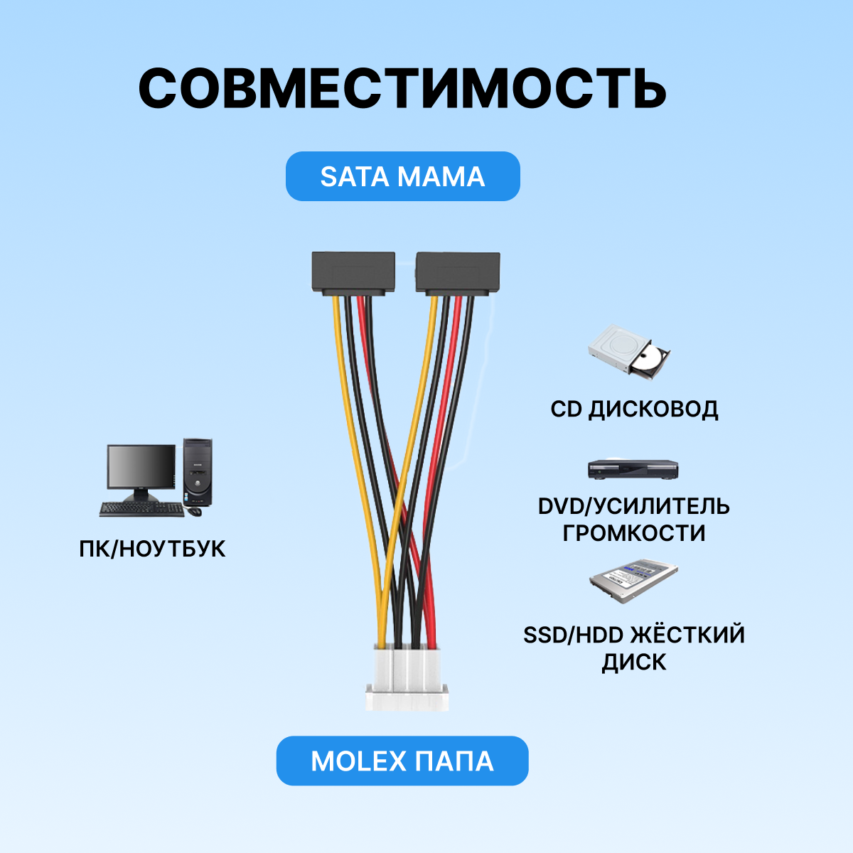 | Разъемы кабеля | Molex 4pin (m) - 2xSATA 15pin (f) |