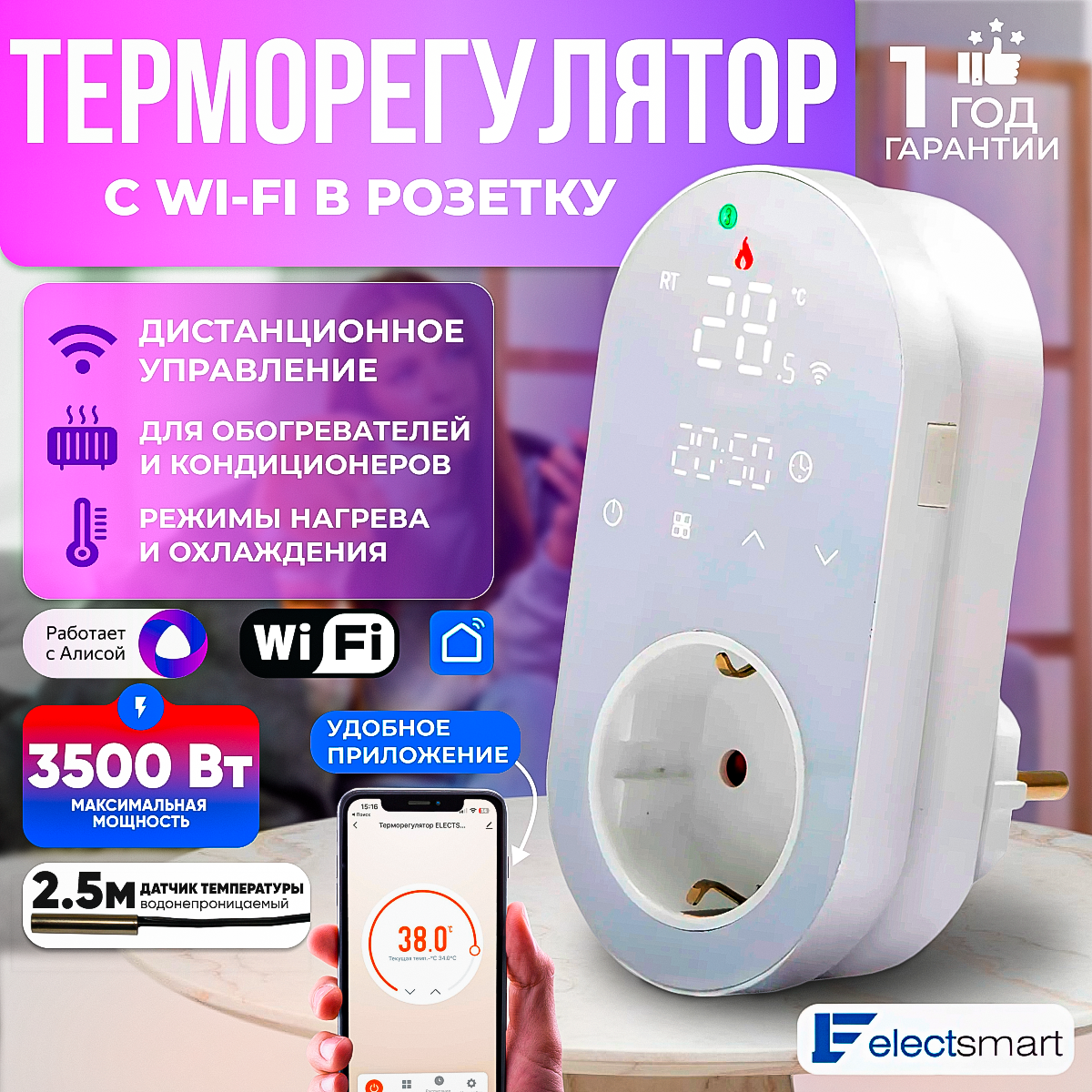 Отзывы на E-11-WiFi-YM Терморегулятор/термостат в розетку для кондиционера, обогревателя. Белый программируемый, сенсорный, с датчиком температуры. Голосовое управление Яндекс Алиса, Smart Life. ELECTSMART