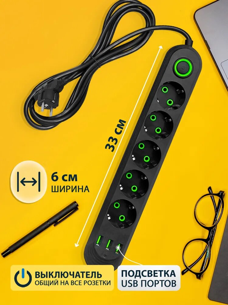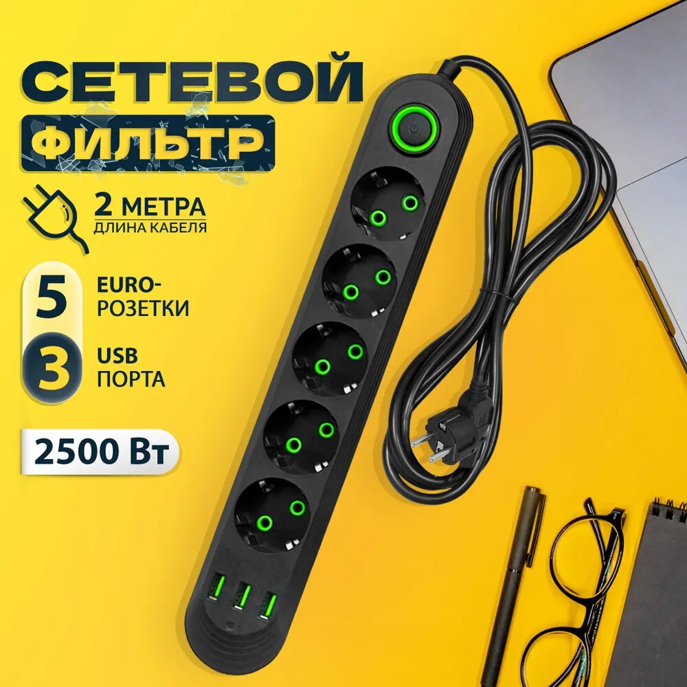10 цен на Сетевой фильтр, удлинитель 2500W на 5 розеток, 3 порта USB, 2 метра, черный