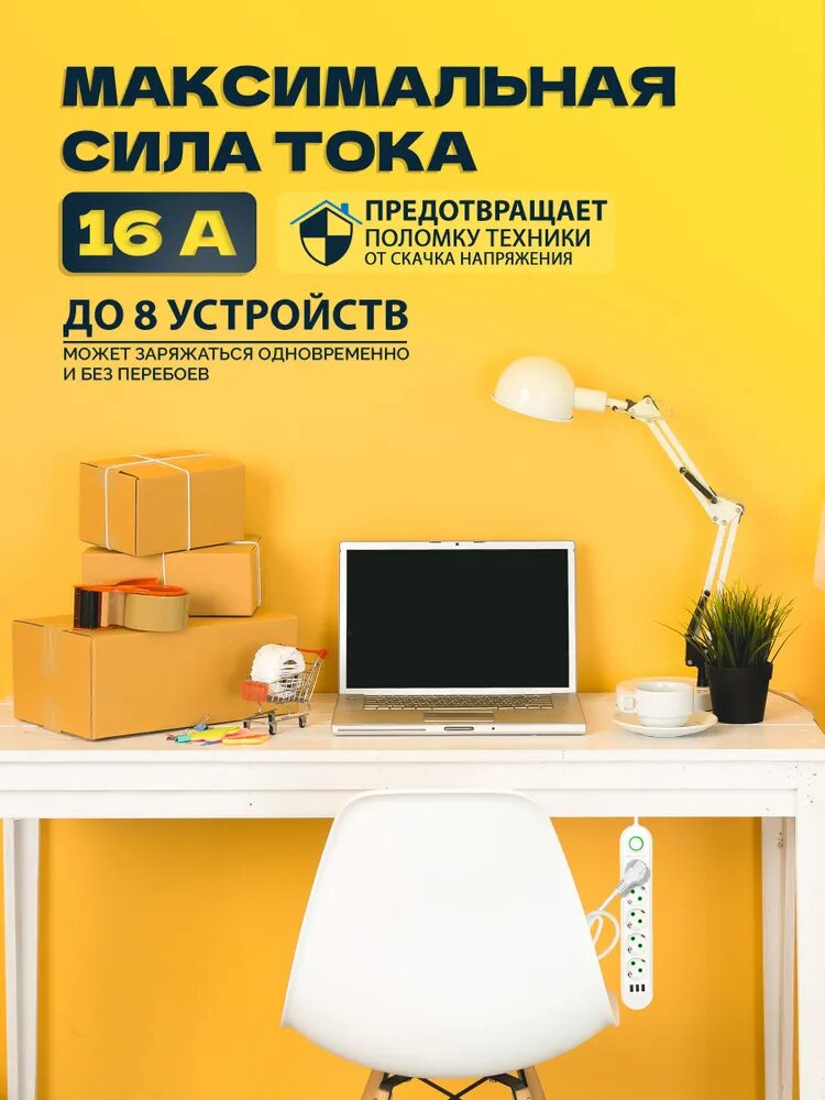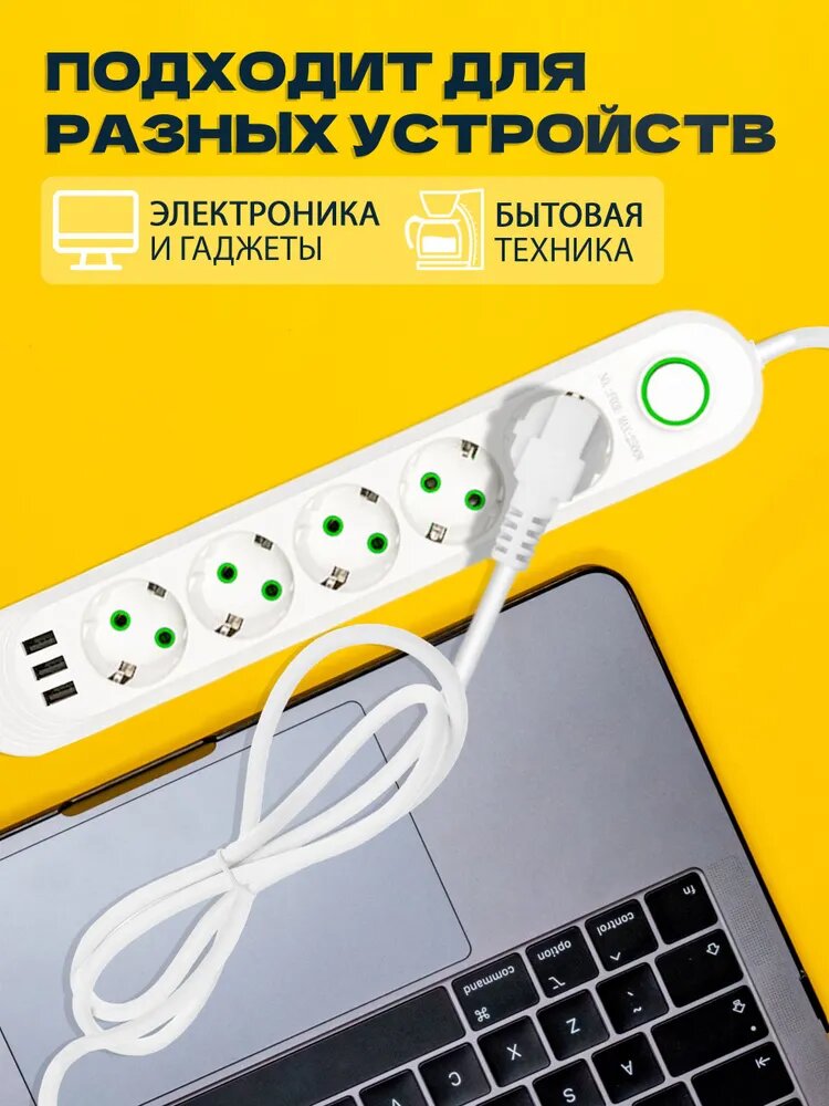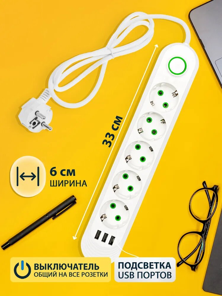 10 цен на Сетевой фильтр, удлинитель 2500W на 5 розеток, 3 порта USB, 2 метра, белый