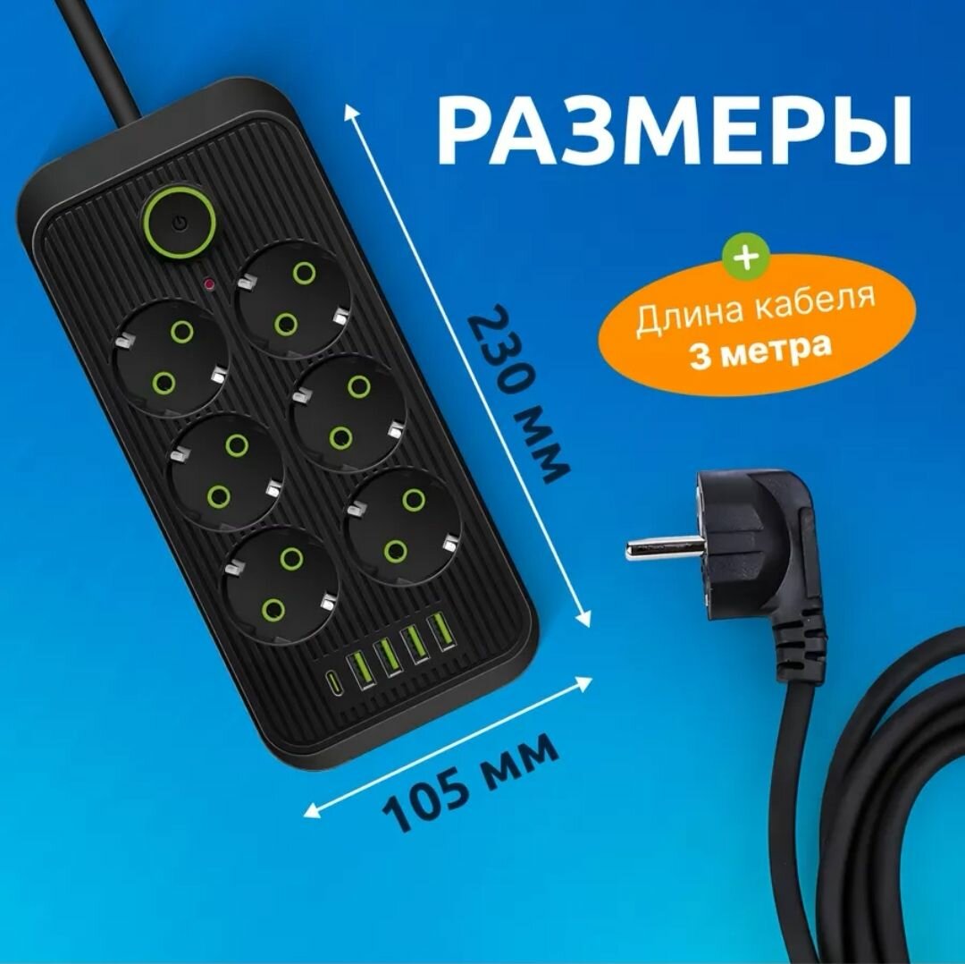 10 цен на Удлинитель сетевой (фильтр) 3 метра 6 розеток с 4 USB и 1 Type-C портами и кнопкой черный
