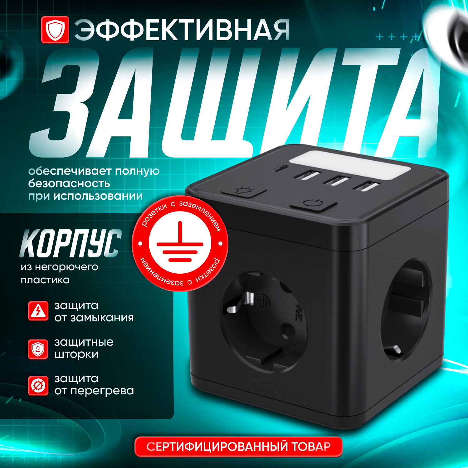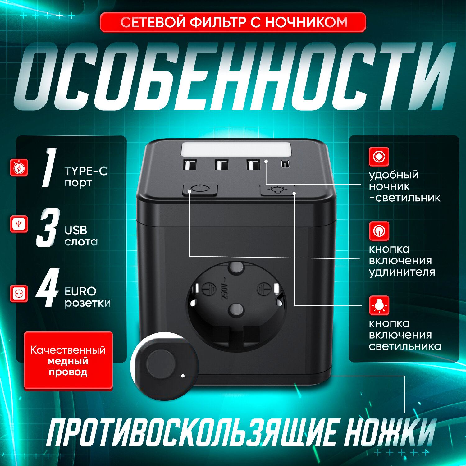 | Дополнительная информация | ночник светильник, TYPE-C порт, USB порты, наличие выключателя и заземление |