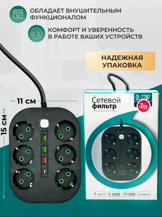 | Комплектация | usb удлинитель с 6 евро розетками с предохранителем и заземлением |