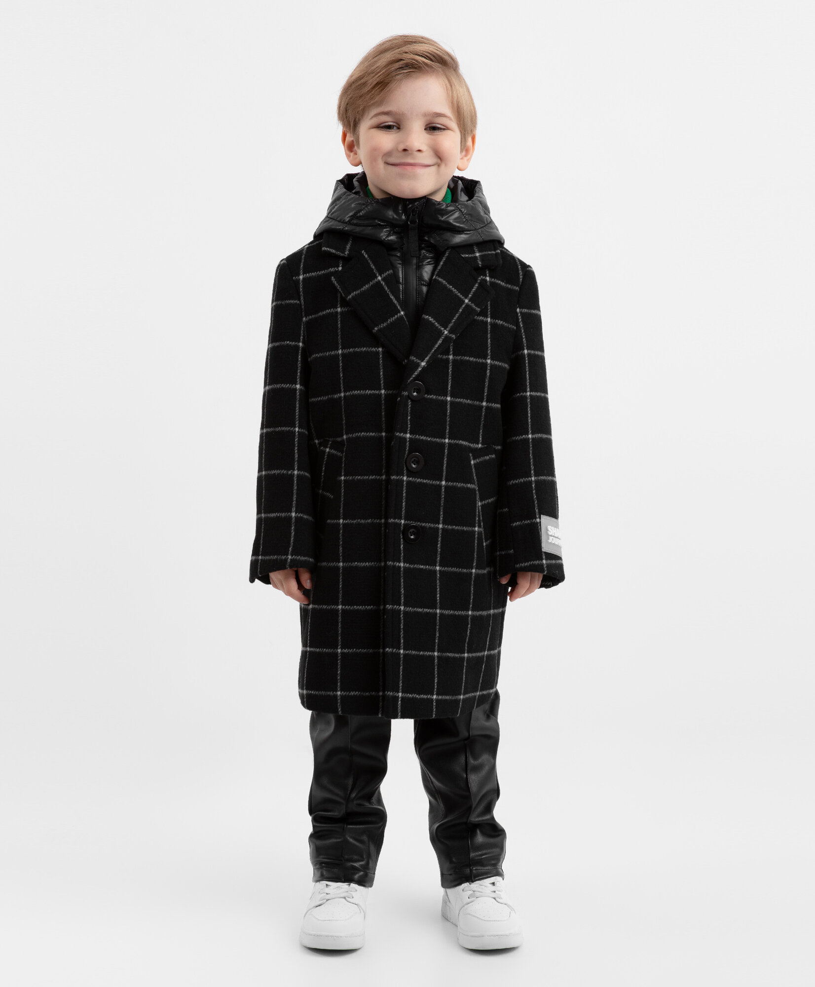 Пальто текстильное с отстёгивающейся манишкой в клетку чёрное для мальчика Gulliver, р.116, мод.22404BMC4505 информация: