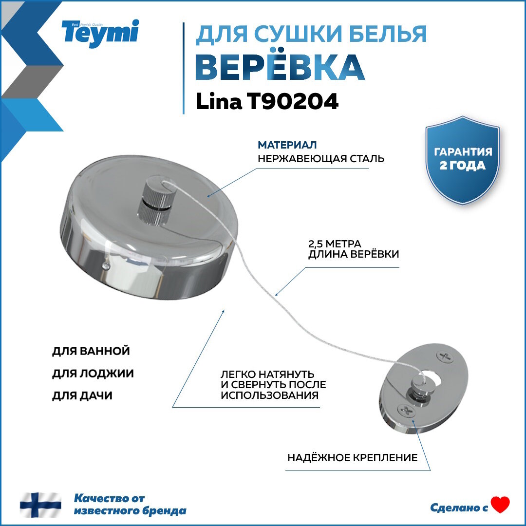 Отзывы на Веревка для сушки одежды Teymi Lina, нержавеющая сталь, глянцевый хром T90204