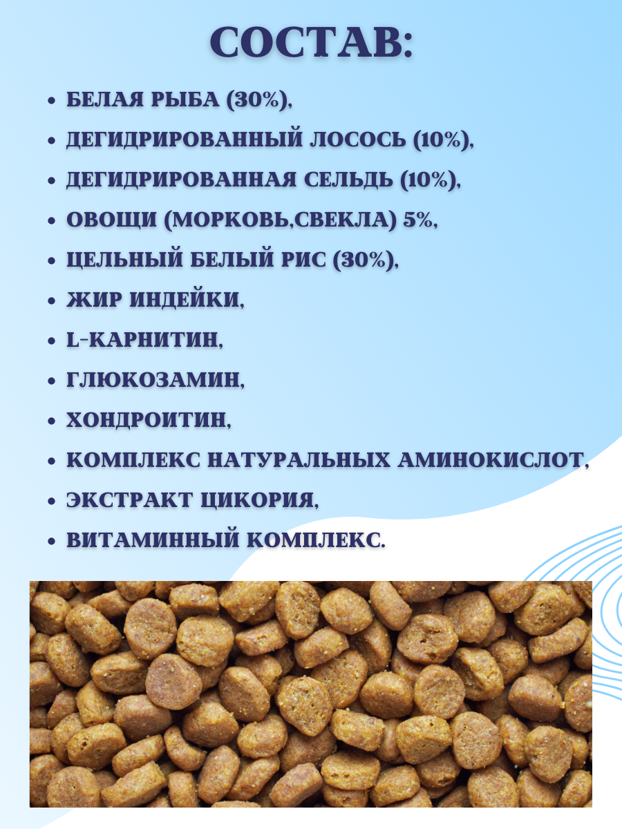 | Состав | Белая рыба 30%, дегидрированный лосось 10%, дегидрированная сельдь 10%, овощи (морковь, свекла) 5%, цельный белый рис 30%, жир индейки, I-карнитин, глюкозамин, хондроитин, комплекс натуральных аминокислот, экстракт цикория, витаминный комплекс. |