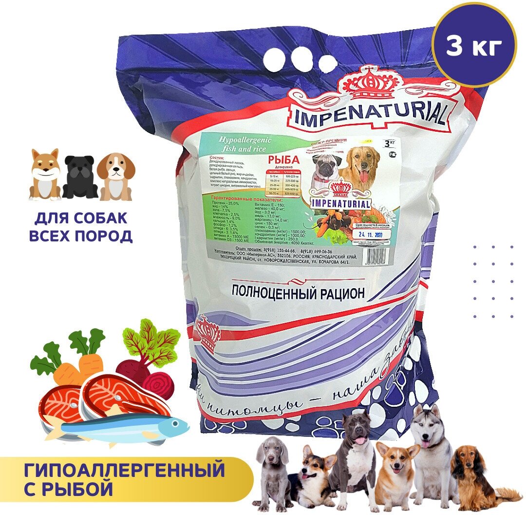 Гипоаллергенный сухой корм для собак всех пород с мясом рыбы Империал 3кг информация:
