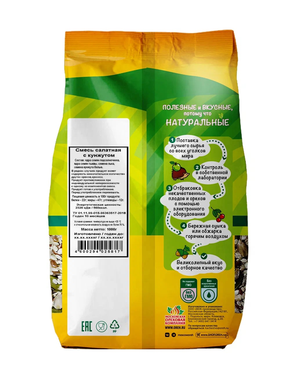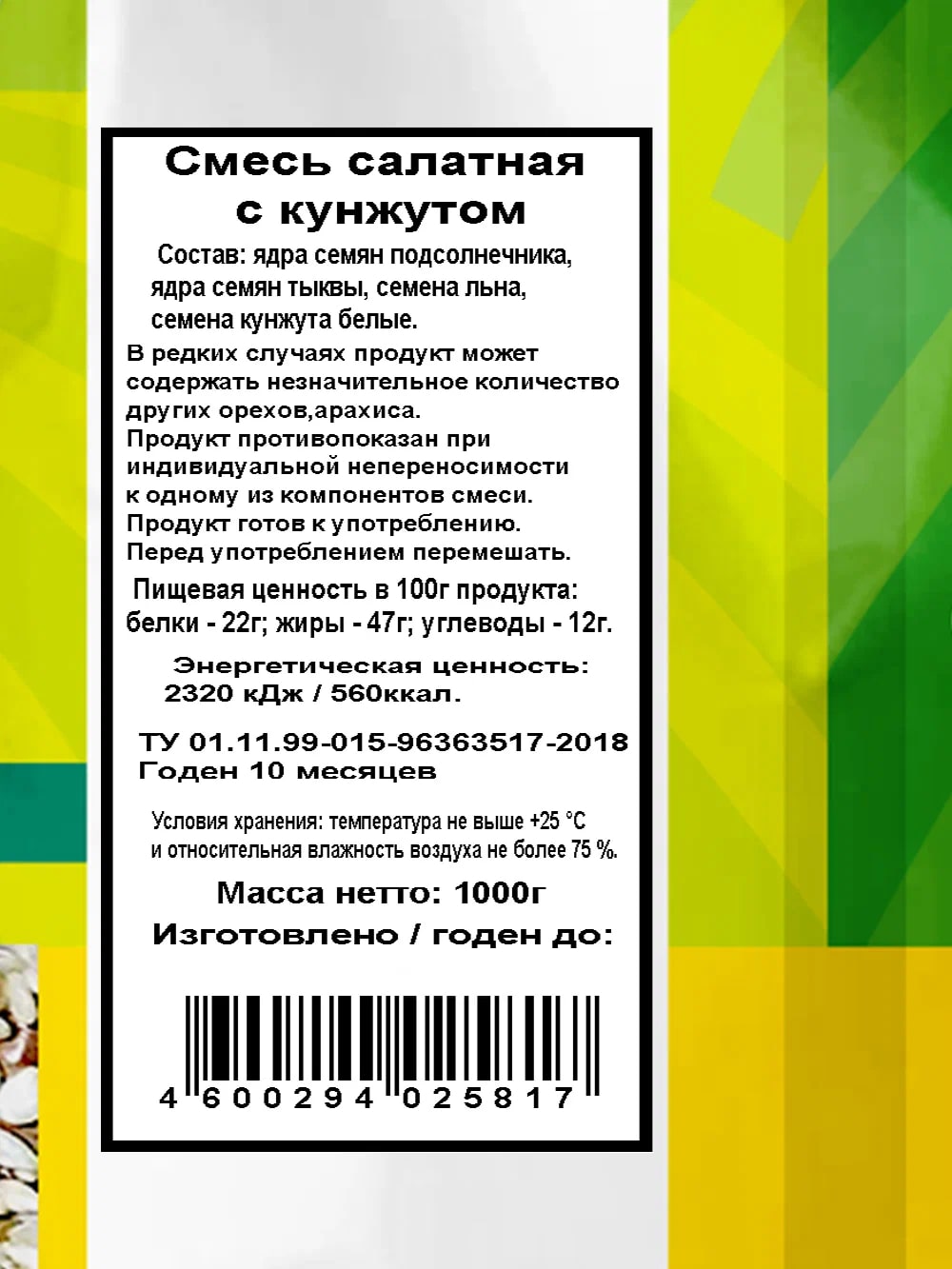 | Состав | ядра семян подсолнечника, ядра семян тыквы, семена льна, семена кунжута белые |