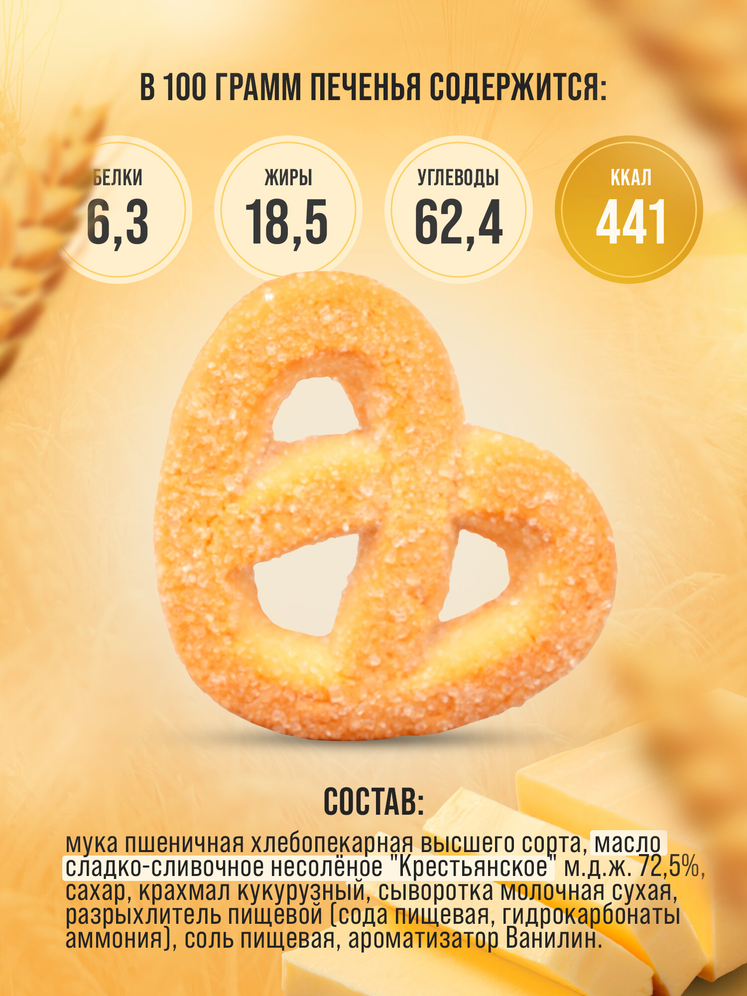 | Состав | Мука пшеничная хлебопекарная высшего сорта, масло сладко- сливочное несолёное «Крестьянское» м.д.ж. 72,5%, сахар, крахмал кукурузный, сыворотка молочная сухая, разрыхлитель пищевой (сода пищевая, гидрокарбонат аммония), соль пищевая, ароматизатор Ванилин. |