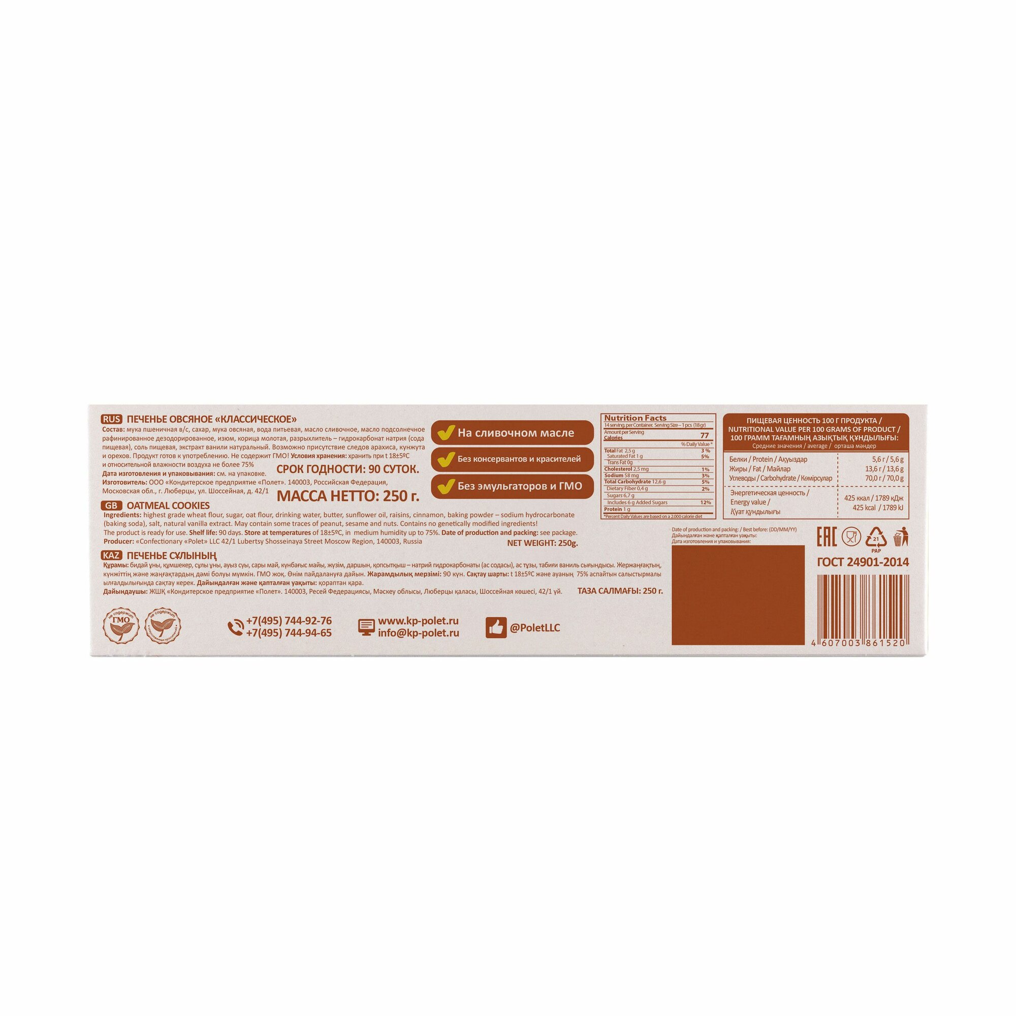 Печенье Овсяное Классическое на сливочном масле, полет, 250г х 4шт информация: