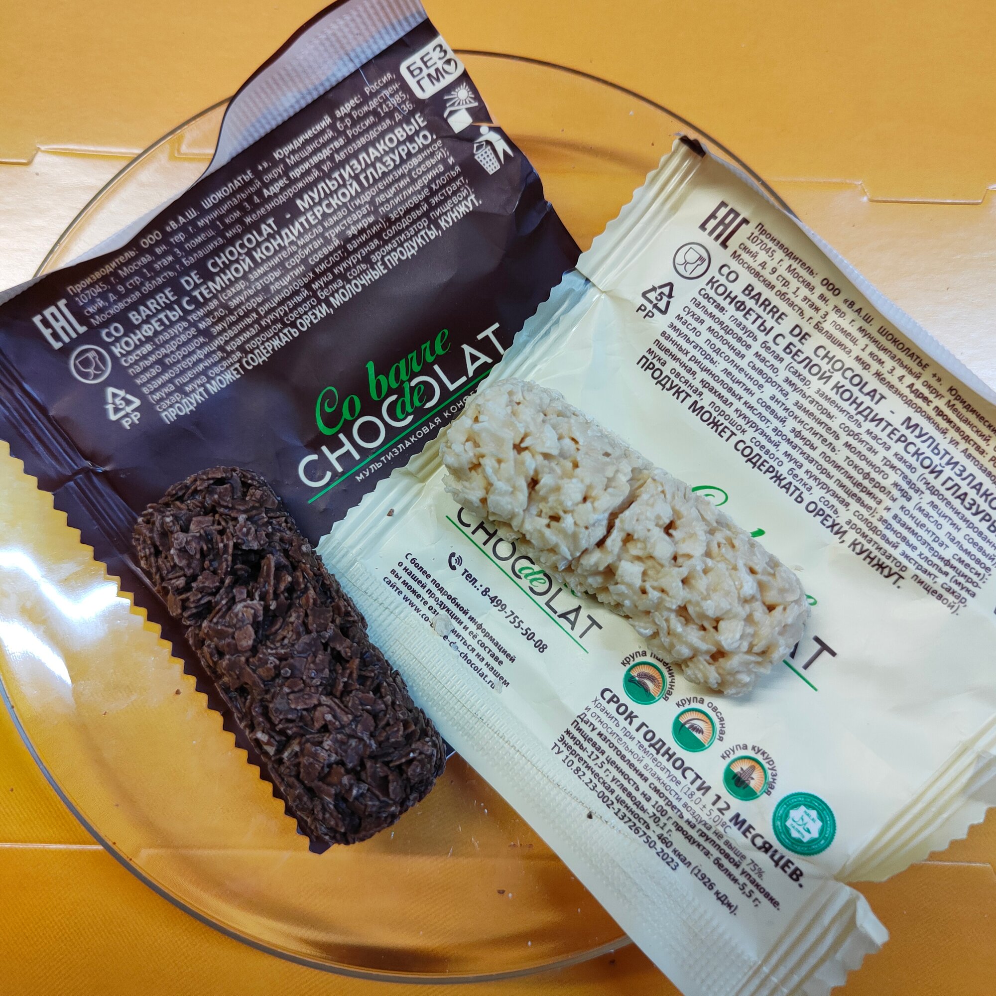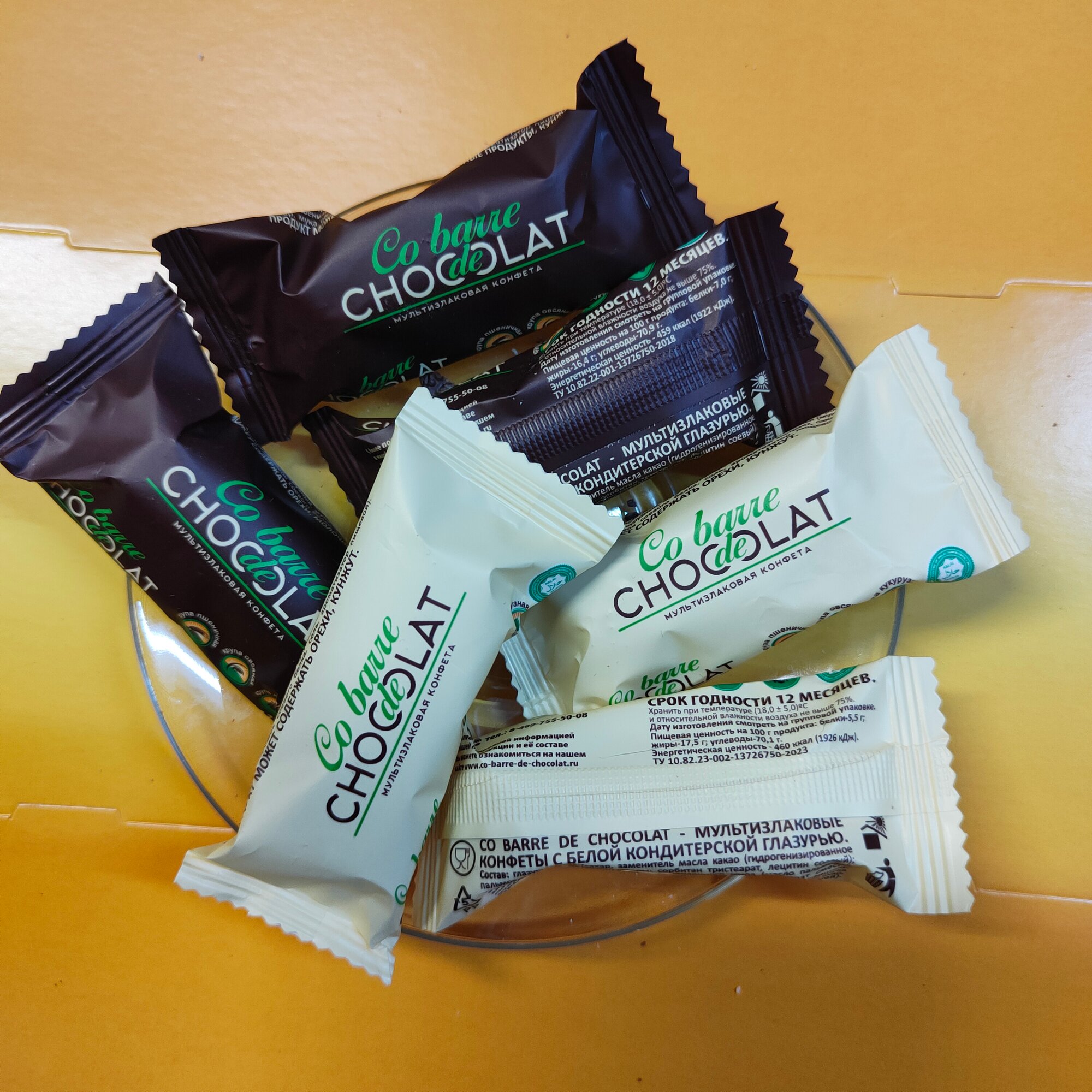 Отзывы на Конфета Мультизлаковая Co barre de CHOCOLAT ассорти с тёмной и с белой глазурью, гофрокороб 2кг