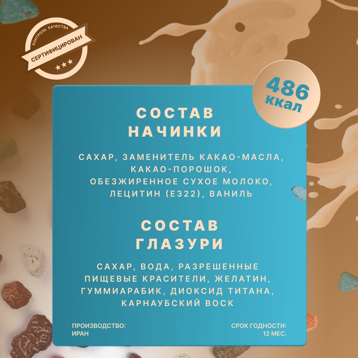 | Состав | Сахар, заменитель какао-масла, какао-порошок, обезжиренное сухое молоко, лецитин (Е322), ваниль. Состав глазури: Сахар, вода, разрешенные пищевые красители, желатин, гуммиарабик, диоксид титана, карнаубский воск |