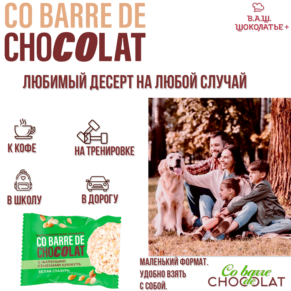 | Состав | глазурь белая (сахар, заменитель масла какао (гидрогенизированное пальмоядровое масло, эмульгаторы: сорбитан тристеарат, лецитин соевый); сухая молочная сыворотка, заменитель молочного жира (масло пальмовое, масло подсолнечное, антиокислитель: токоферолы концентрат смеси); эмульгаторы: лецитин соевый, эфиры полиглицерина и взаимоэтерифицированных рициноловых кислот; ароматизаторы пищевые); зерновые хлопья (мука пшеничная, крахмал кукурузный, мука кукурузная, солодовый экстракт, сахар, мука овсяная, порошок соевого белка, соль, ароматизатор пищевой); кунжут. Продукт может содержать орехи. |