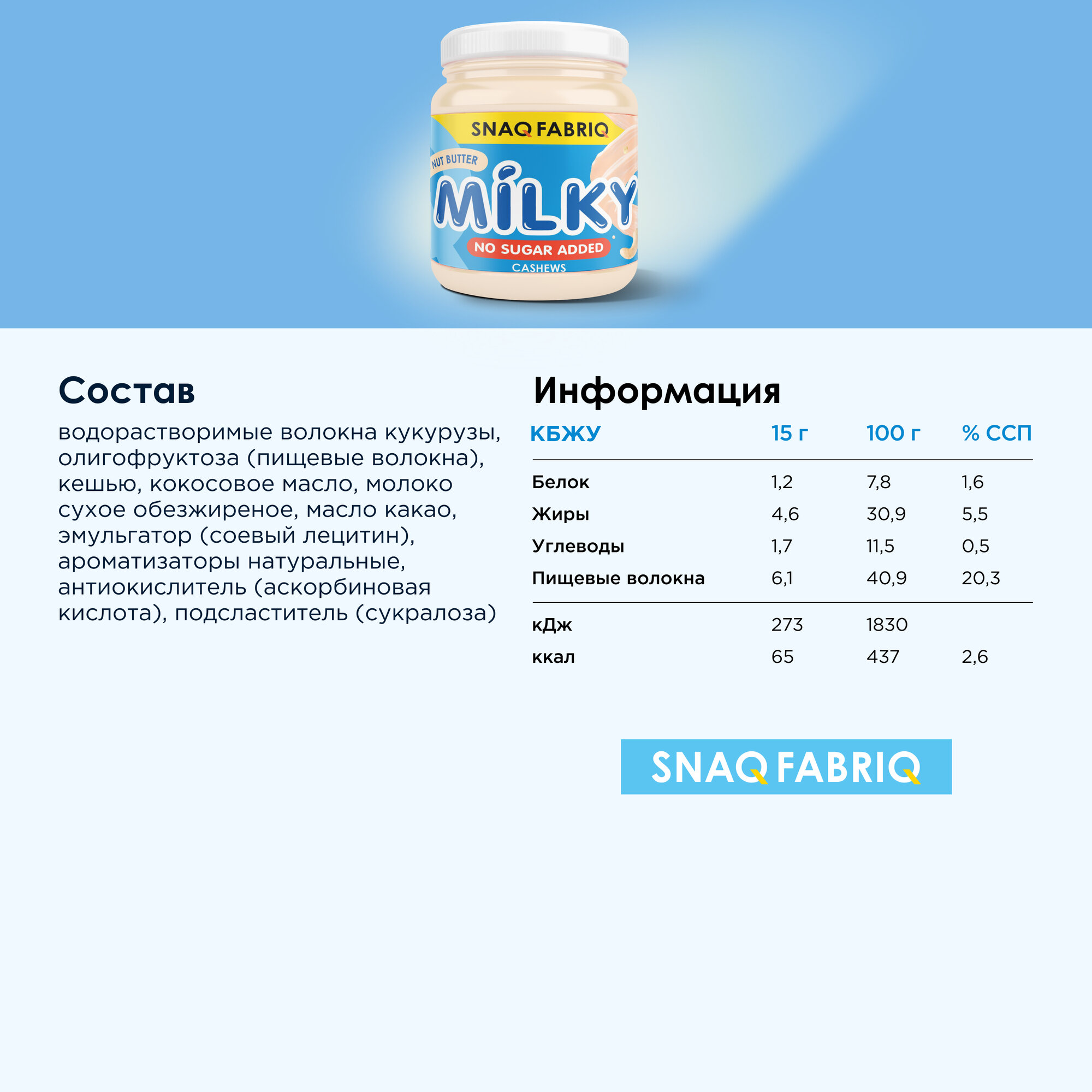 Snaq Fabriq молочно-ореховая паста MILKY без сахара с кешью, 250г информация:
