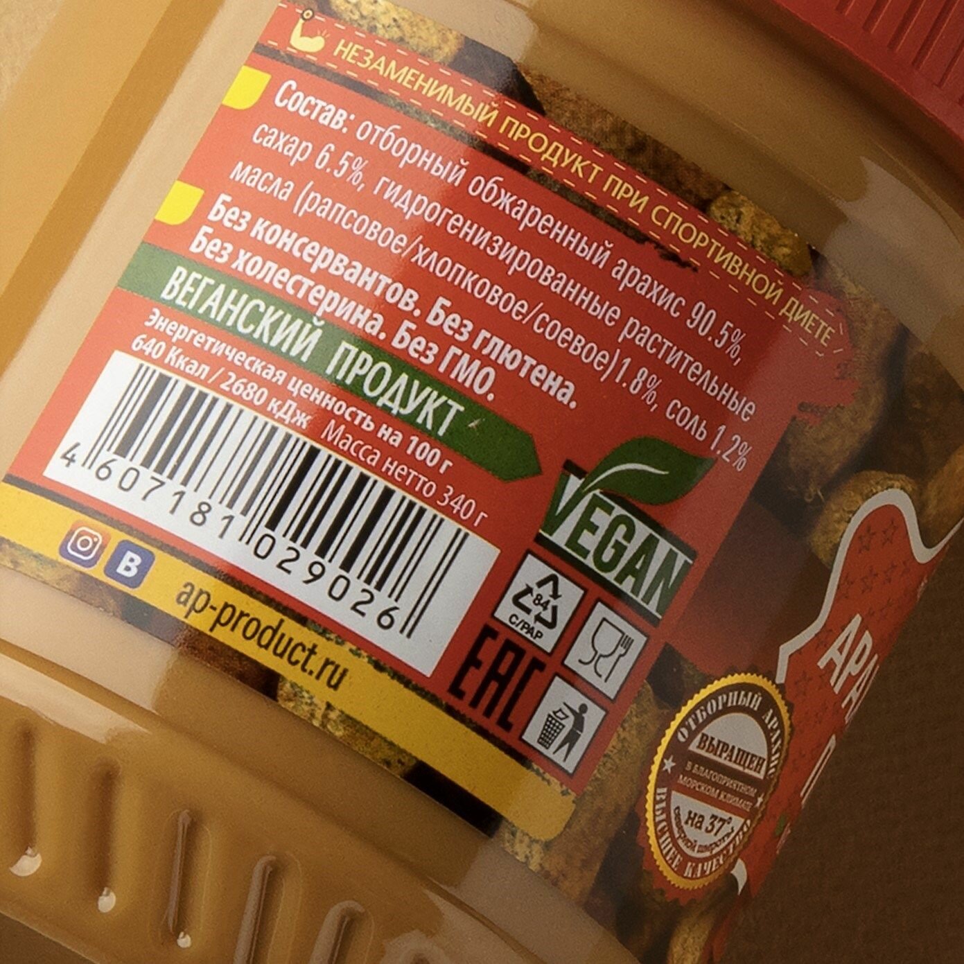 | Состав | Отборный обжаренный арахис 90,5%, сахар 6,5%, гидрогенизированные растительные масла (рапсовое/хлопковое/соевое) 1,8%, соль 1,2%. |