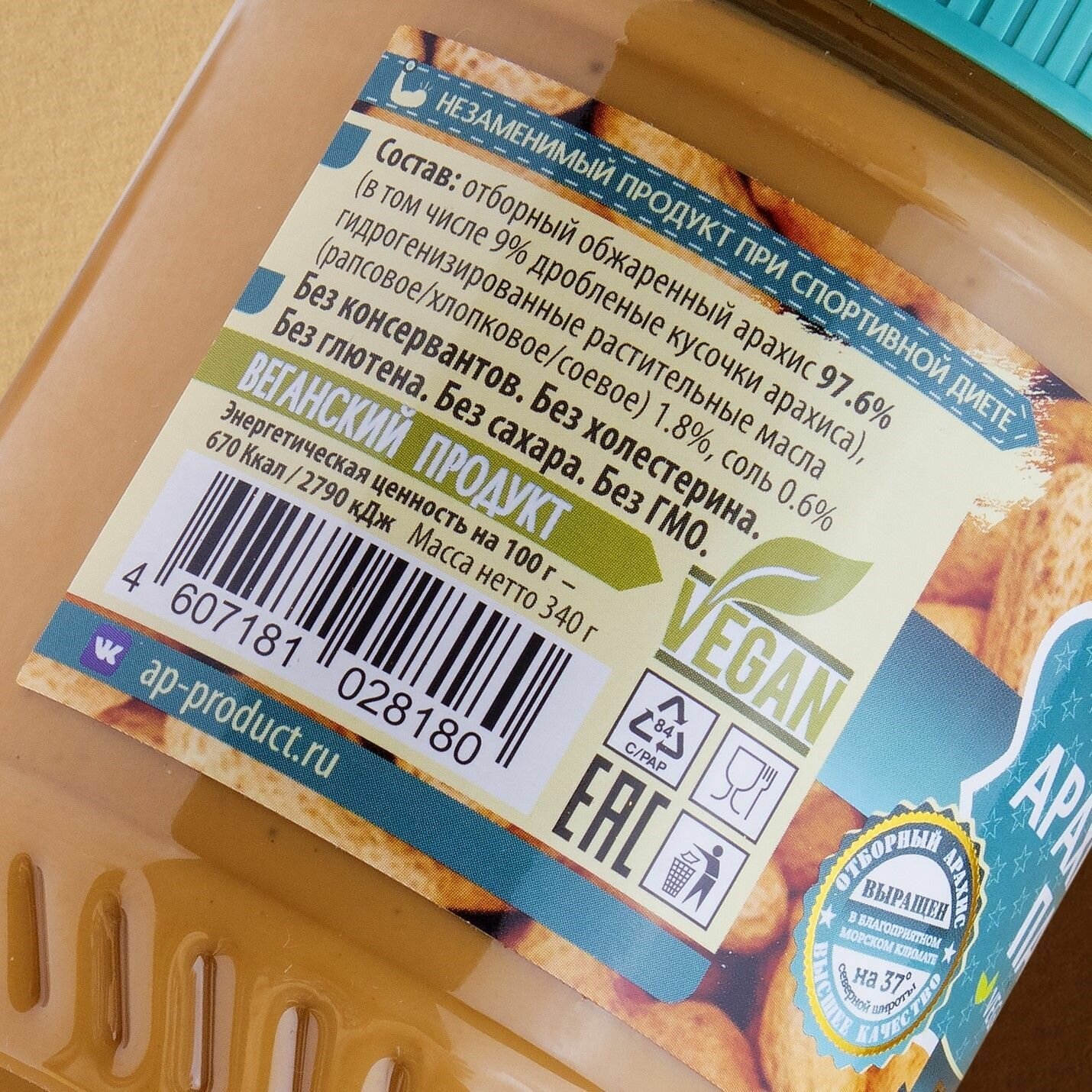 | Состав | Отборный обжаренный арахис 97,6% (в том числе 9% дробленые кусочки арахиса), гидрогенизированные растительные масла (рапсовое/хлопковое/соевое) 1,8%, соль 0,6%. |