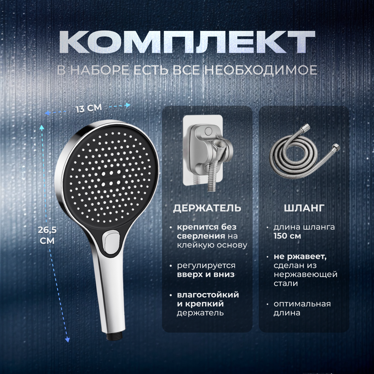 Лейка для душа со шлангом 1,5 м водосберегающая, 3 режима, держатель для лейки, душевой комплект серебристый информация: