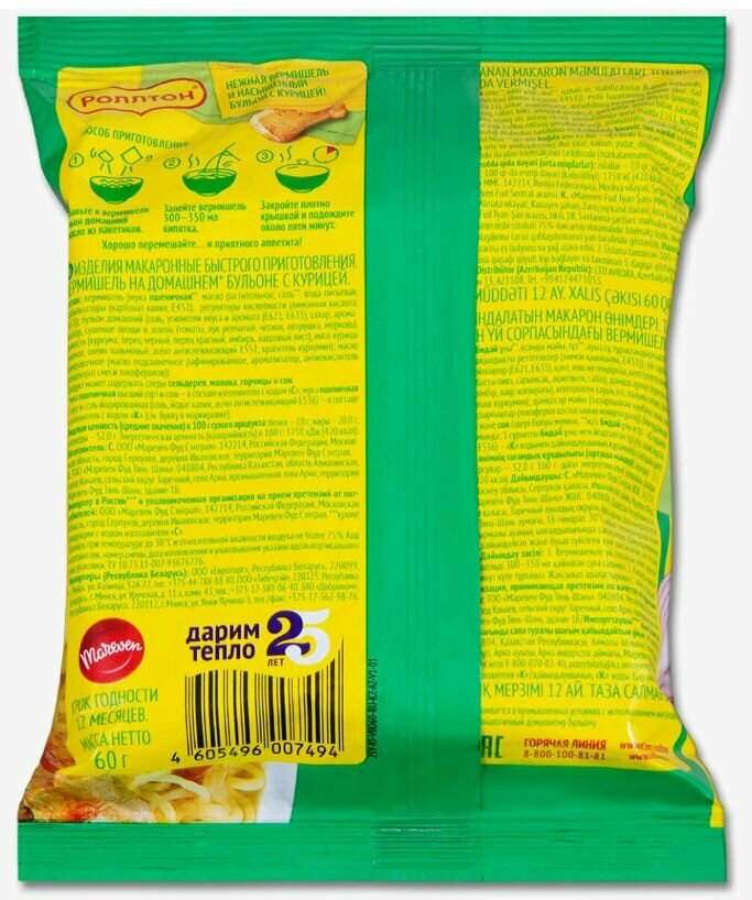 Вермишель быстрого приготовления Роллтон на бульоне (курица) 60 гр - 20 штук информация: