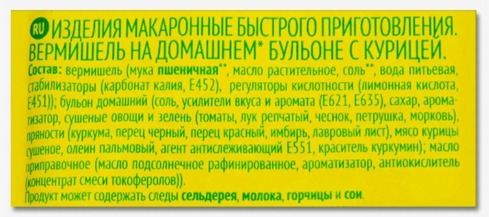 | Состав | лапша: мука пшеничная в/с, масло растительное, крахмал кукурузный и тапиоковый, вода питьевая, соль, яичный порошок, загуститель (гуаровая камедь), стабилизатор (карбонат калия), разрыхлитель (гидрокарбонат натрия), регулятор кислотности (лимонная кислота), усилитель вкуса и аромата (Е621), бульон-приправа: соль, сахар, усилители вкуса и аромата (Е621, Е635), крахмал кукурузный, ароматизаторы, овощи сушеные(чеснок, лук репчатый), пряности (имбирь, перец красный и черный, куркума), экстракт дрожжей, мясо сушеное, олеин пальмовый, агент антислеживающий (Е551), краситель (Е101(i)), смесь с овощами сушеными: соевый текстурат, морковь, лук зеленый. Продукт может содержать незначительное количество продуктов переработки молока. |