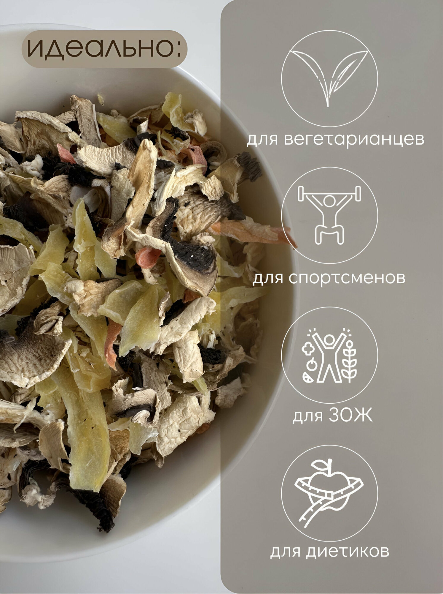 | Состав | Сушеные шампиньоны, картофель, морковь, лук репчатый, чеснок, укроп, душистый перец, черный перец горошком, лавровый лист. |