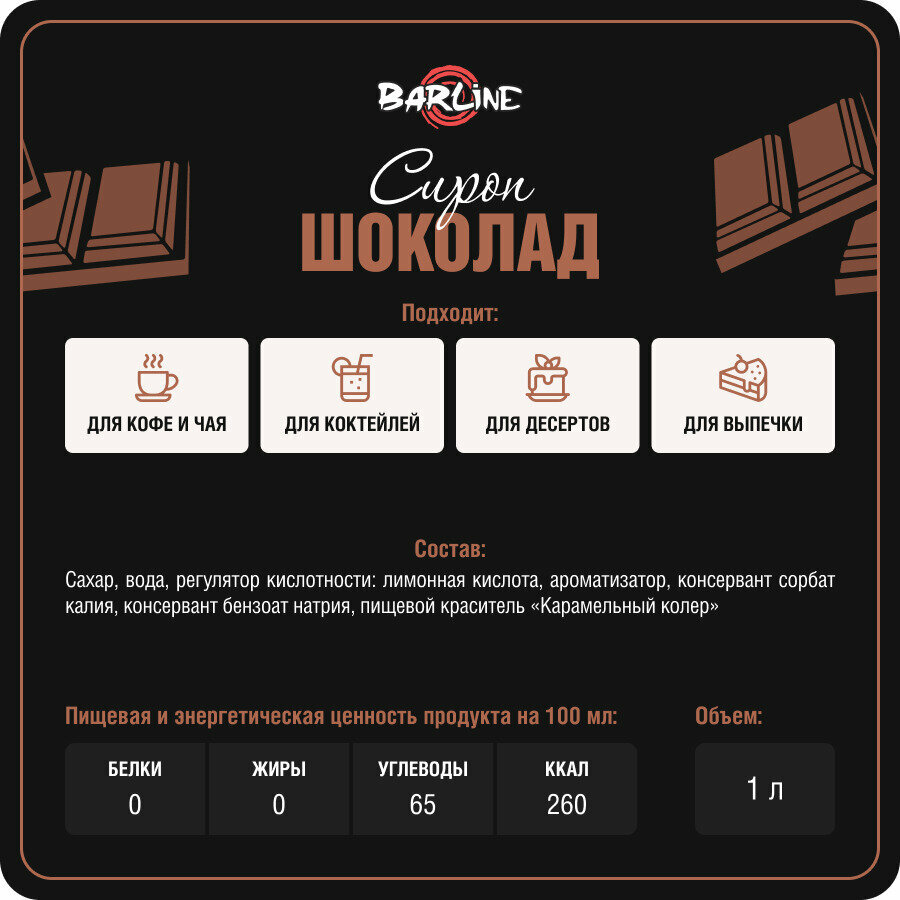 Сироп Barline Шоколад (Chocolate), 1 л, для кофе, чая, коктейлей и десертов, стеклянная бутылка c рассекателем, Барлайн информация:
