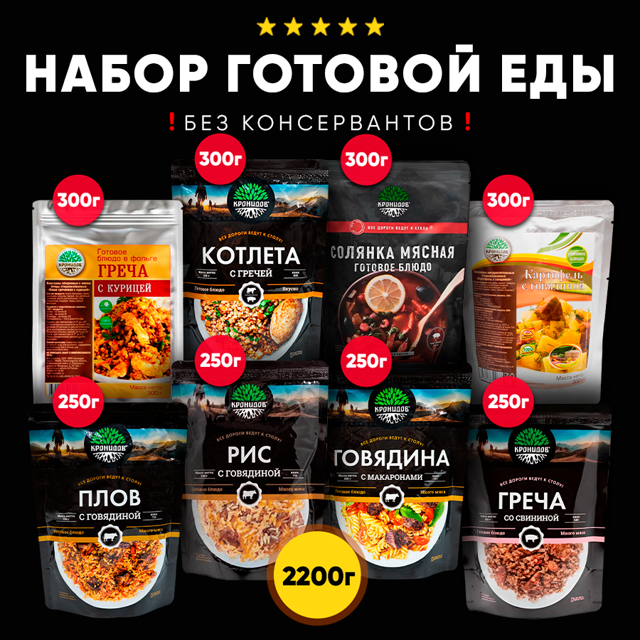 Набор из 8 готовых блюд в фольге от ТМ "Кронидов" Греча с говядиной, Макароны с говядиной, Рис с говядиной, Плов с говядиной, Суп гороховый, Куриный суп по-домашнему, Солянка, Борщ. Консервированные блюда 2 239 ₽