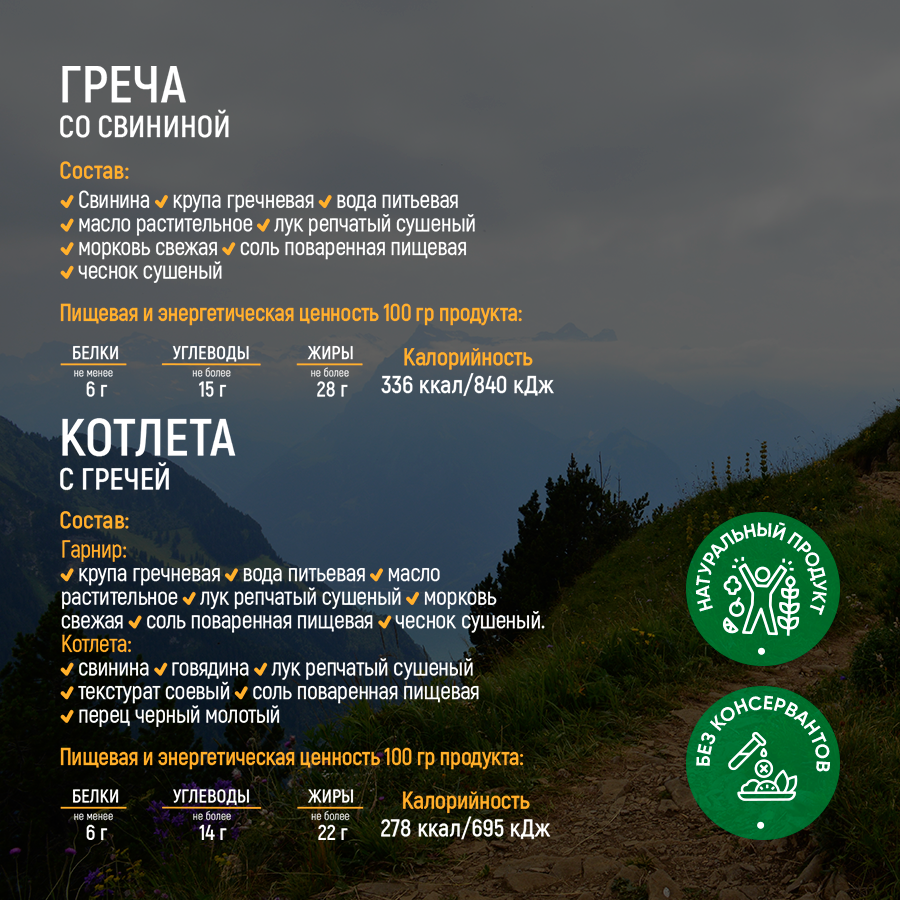 | Дополнительная информация | Состав и содержание калорий указано в инфографике для каждого блюда отдельно. |