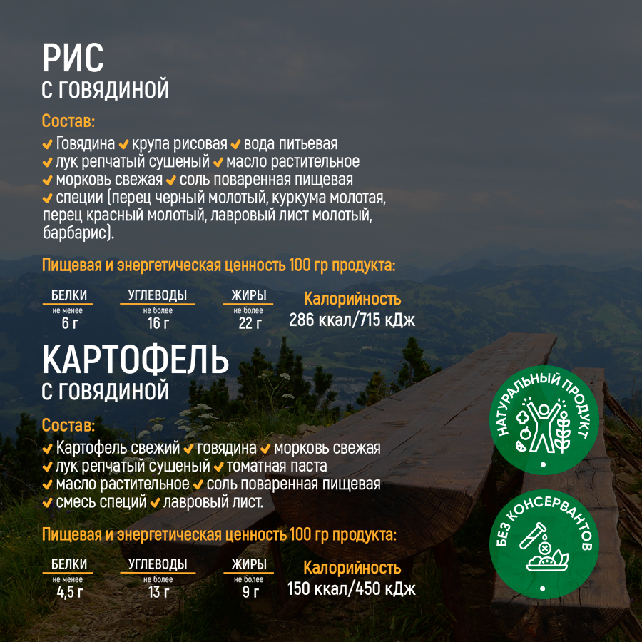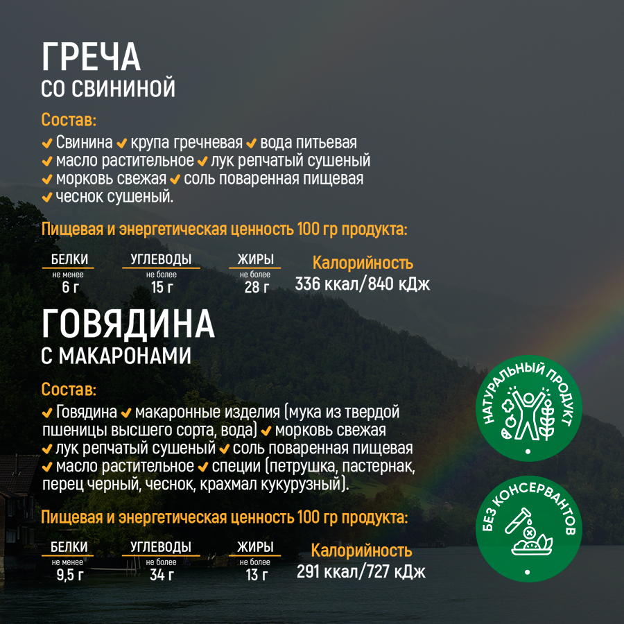 | Дополнительная информация | Состав и содержание калорий указано в инфографике для каждого блюда отдельно. |