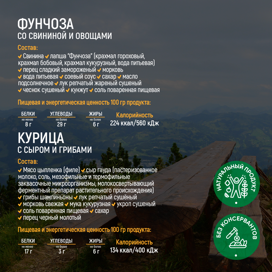 | Дополнительная информация | Состав и содержание калорий указано в инфографике для каждого блюда отдельно. |