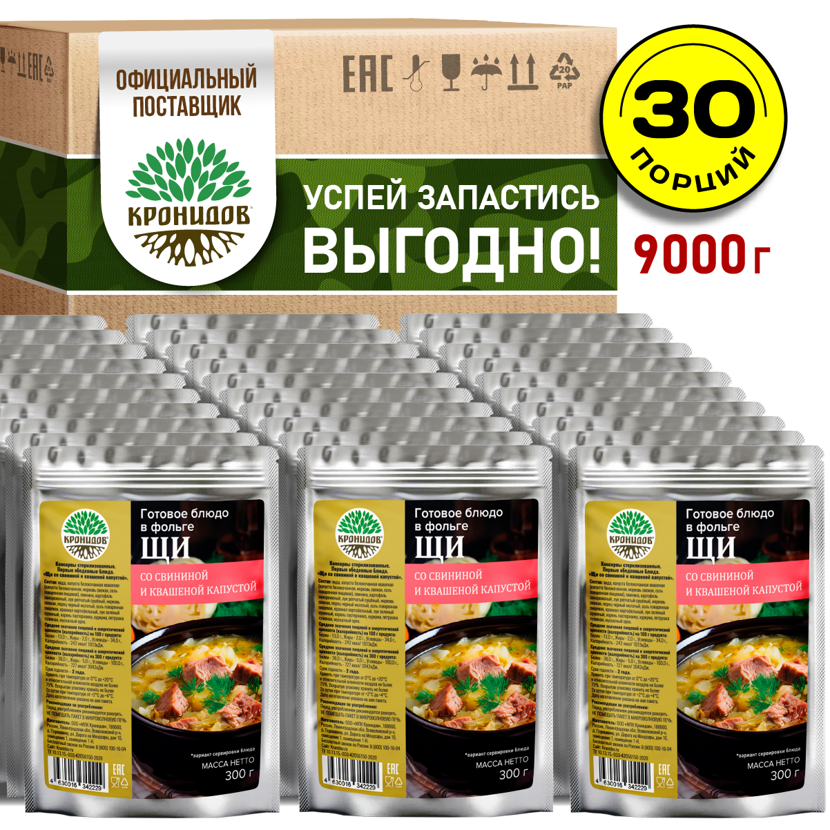 Щи со свининой и квашеной капустой Готовое блюдо в реторт-пакете ТМ Кронидов. Консерва Набор 30 шт. по 300 г информация: