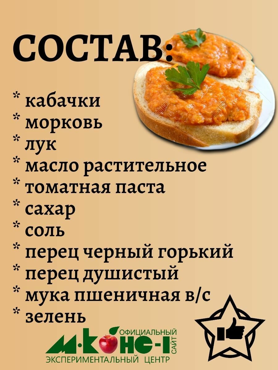 | Состав | Кабачки, морковь, лук, масло растительное, томатная паста, сахар, соль, перец черный горький, перец душистый, мука пшеничная в/с, зелень. |
