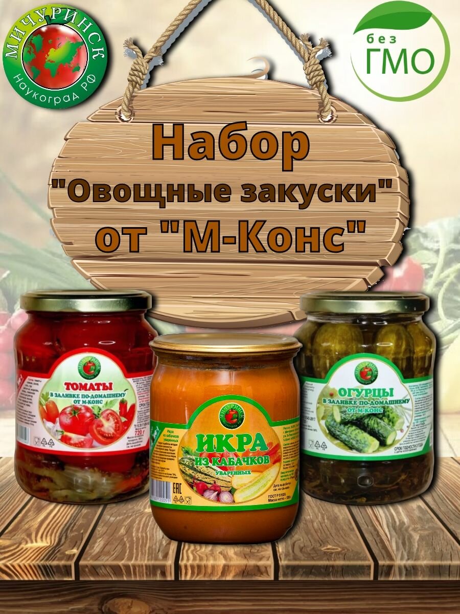 | Состав | Икра кабачковая: Икра, соль, перец душистый, лук репчатый, морковь, зелень Помидоры маринованные: томаты свежие, соль, сахар, зелень, чеснок, душистый и черный перец, морковь, лук репчатый Огурцы маринованные: огурцы свежие, соль, сахар, перец душистый и черный, лук репчатый, морковь, зелень |
