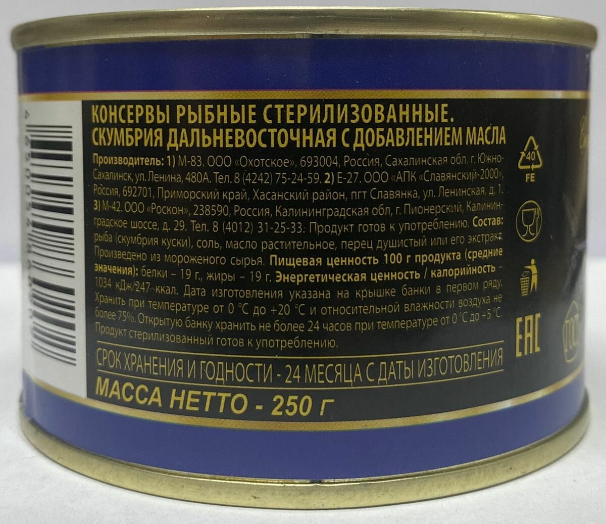 | Состав | Скумбрия, соль, масло растительное, перец душистый |