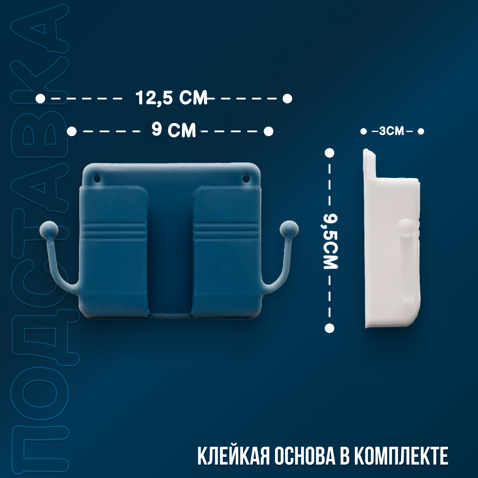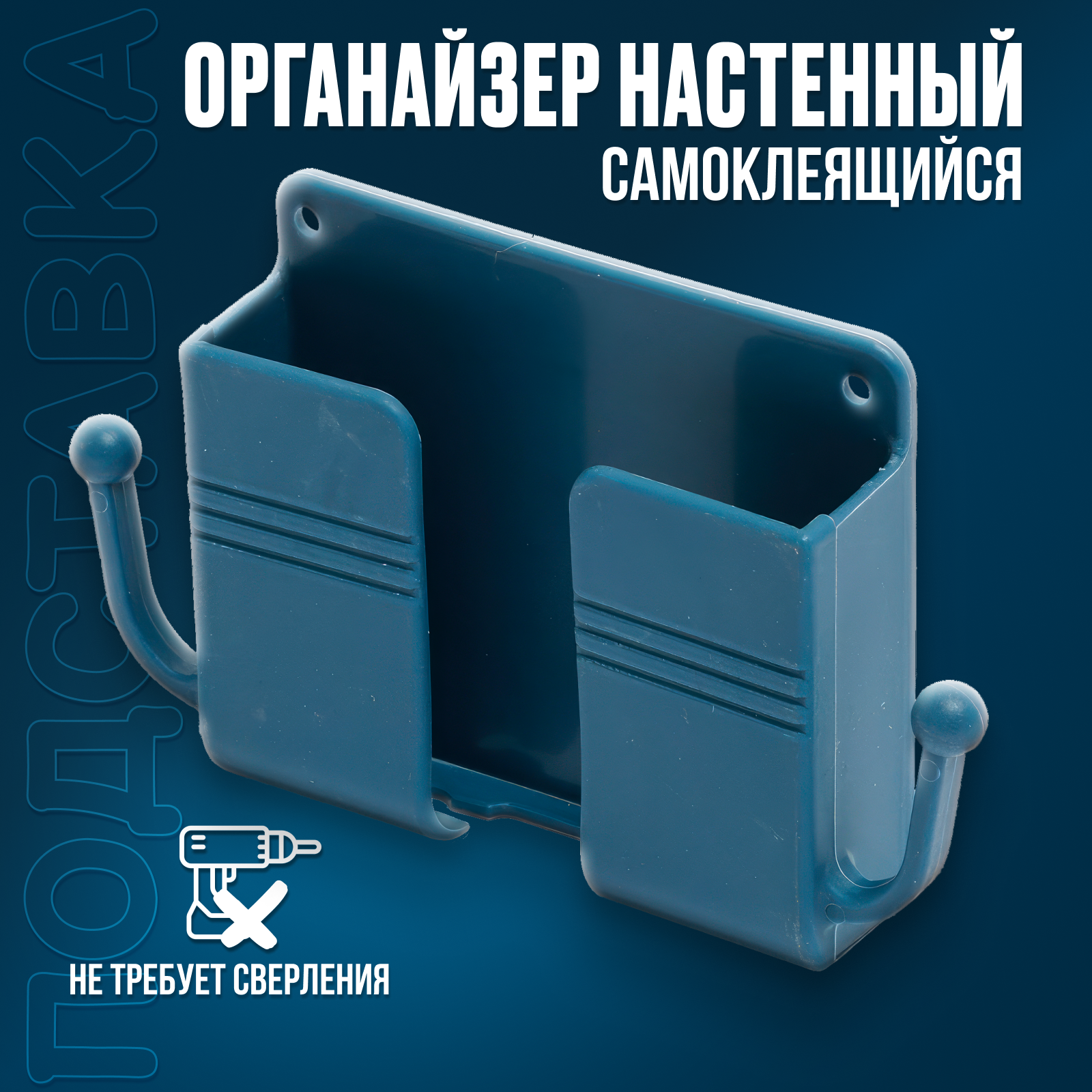 Настенный держатель синий, органайзер для телефона, пульта и проводов с крючками - ручками, самоклеящийся информация: