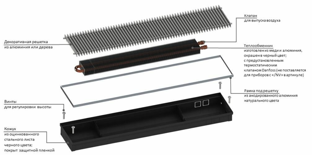 | Комплектация | Теплообменник; Короб (включая рамку); Решетка; Комплект для фиксации прибора в полу; Заглушка и кран Маевского; Инструкция по монтажу. |