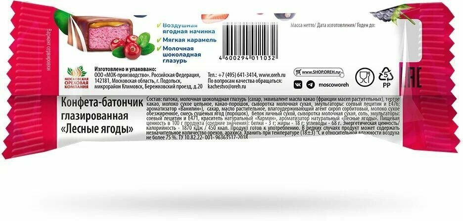 | Состав | патока, молочная шоколадная глазурь (сахар, эквивалент масла какао (фракции масел растительных), тертое какао, молоко сухое цельное, какао-порошок, сыворотка молочная сухая, эмульгаторы: соевый лецитин и Е476; ароматизатор «Ванилин»), сахар, масло растительное, влагоудерживающий агент сироп сорбитовый, молоко сухое обезжиренное, смесь сушеных ягод (порошок), белок яичный сухой, сыворотка молочная сухая, соль, эмульгаторы: соевый лецитин и Е471, краситель натуральный «Кармин», ароматизатор натуральный «Лесные ягоды». |