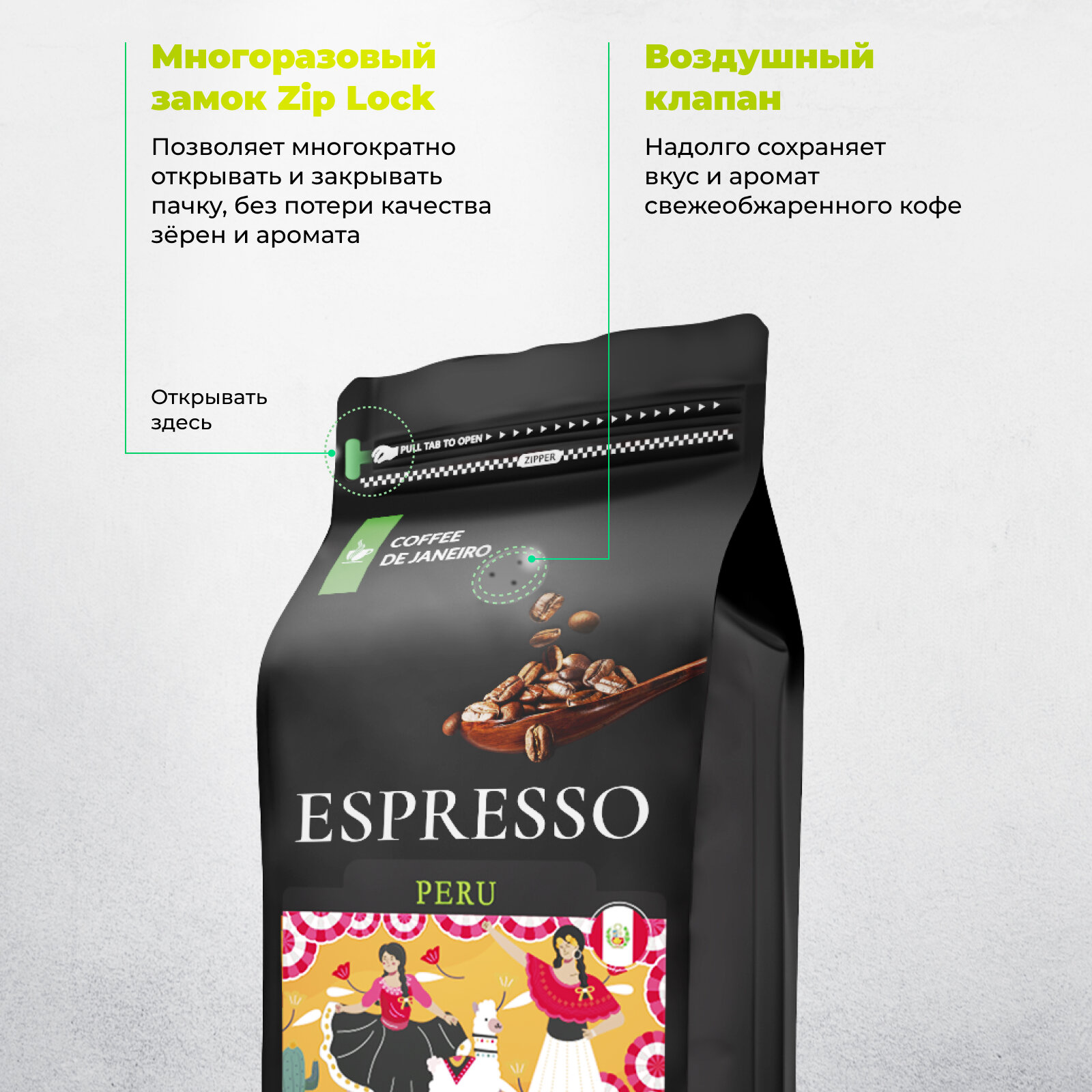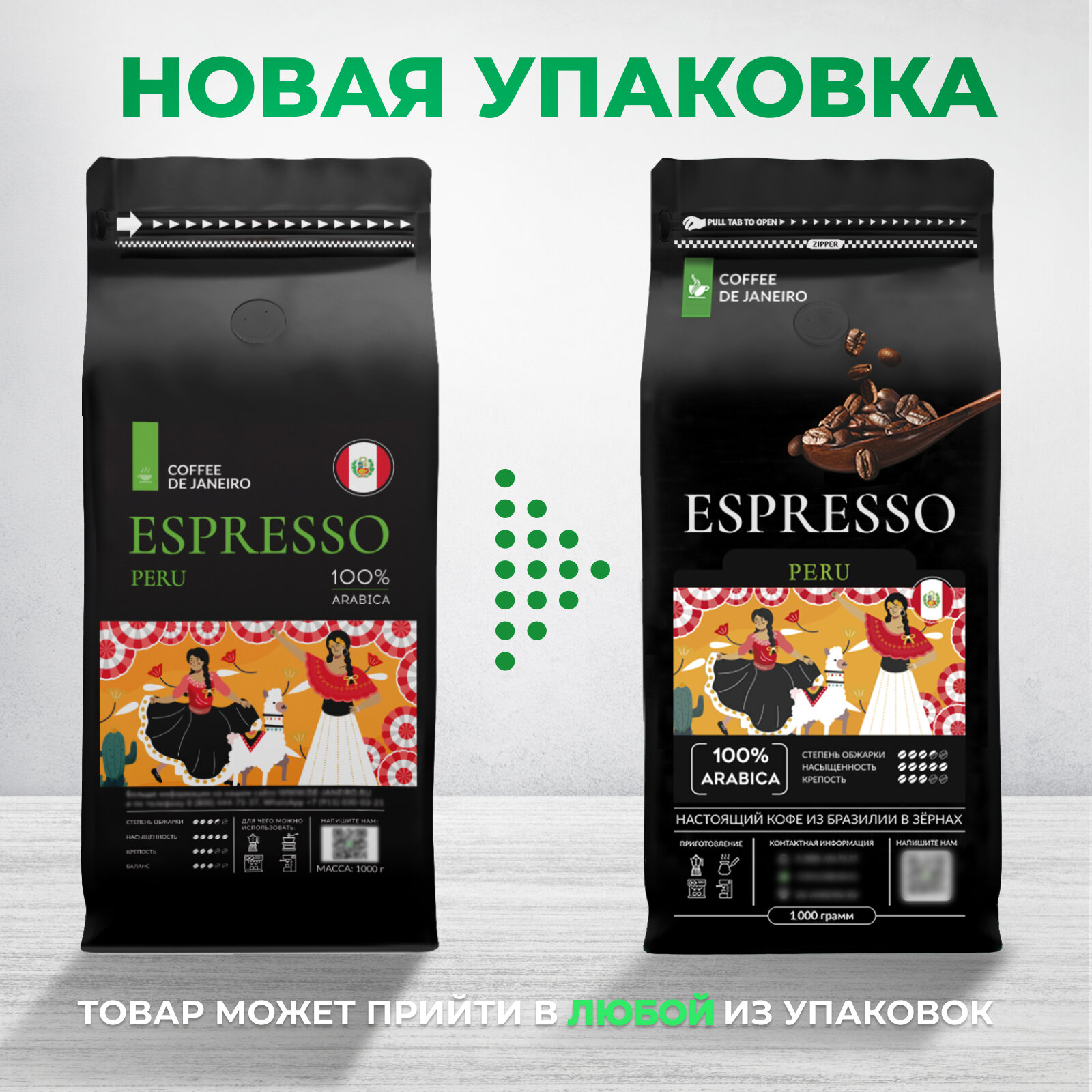 Бразильский кофе в зёрнах 1кг DE JANEIRO (ДЕ жанейро) Кофе в зёрнах 1 кг ESPRESSO PERU 100% Арабика, в упаковке Zip-Lock / Зерновой кофе 1 кг