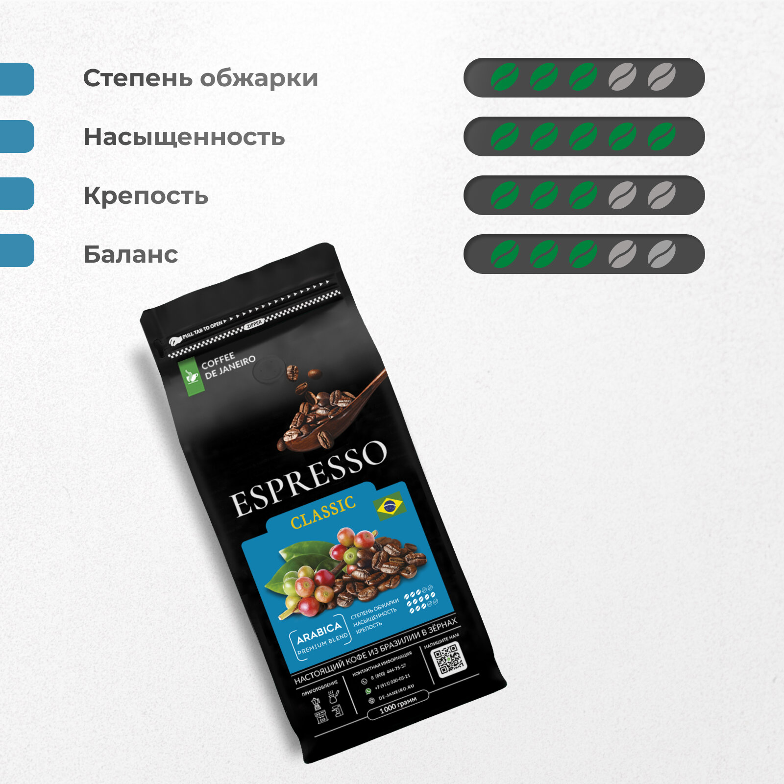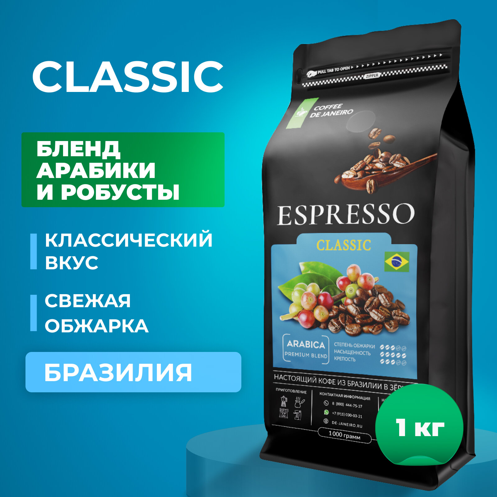 Бразильский кофе в зёрнах DE JANEIRO (Де Жанейро) ESPRESSO CLASSIC (Премиум бленд, Арабика / Робуста), 1кг в упаковке Zip-Lock / Зерновой кофе 1 кг