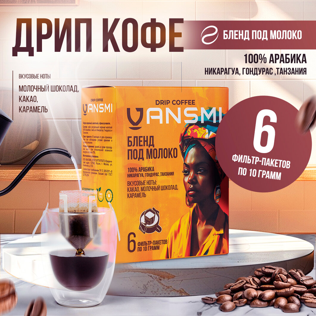 Дрип кофе VANSMI Бленд под молоко 6шт*10гр Кофе молотый в дрип пакетах
