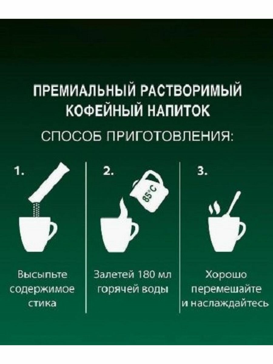 | Способ приготовления | Насыпьте одну пачку в кружку. Добавьте 180 мл горячей воды, но подождите 30 секунд, прежде чем наливать кипящую воду, потому что идеальная температура воды должна быть 85°С. Хорошо перемешайте и наслаждайтесь кофе. |